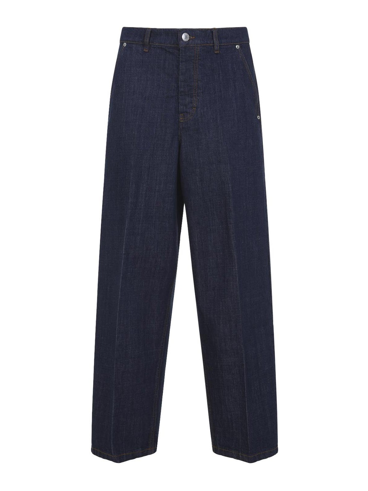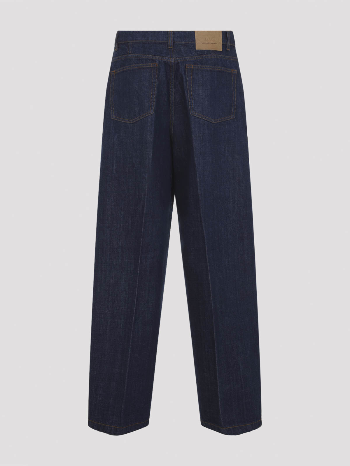 Jean coupe ballon en coton bleu indigo Ami. Jean en coton bleu indigo pur, fermeture zippée dissimulante sur le devant, fermeture boutonnée sur le devant, passants de ceinture, design à cinq poches, coupe ballon, ourlet droit.