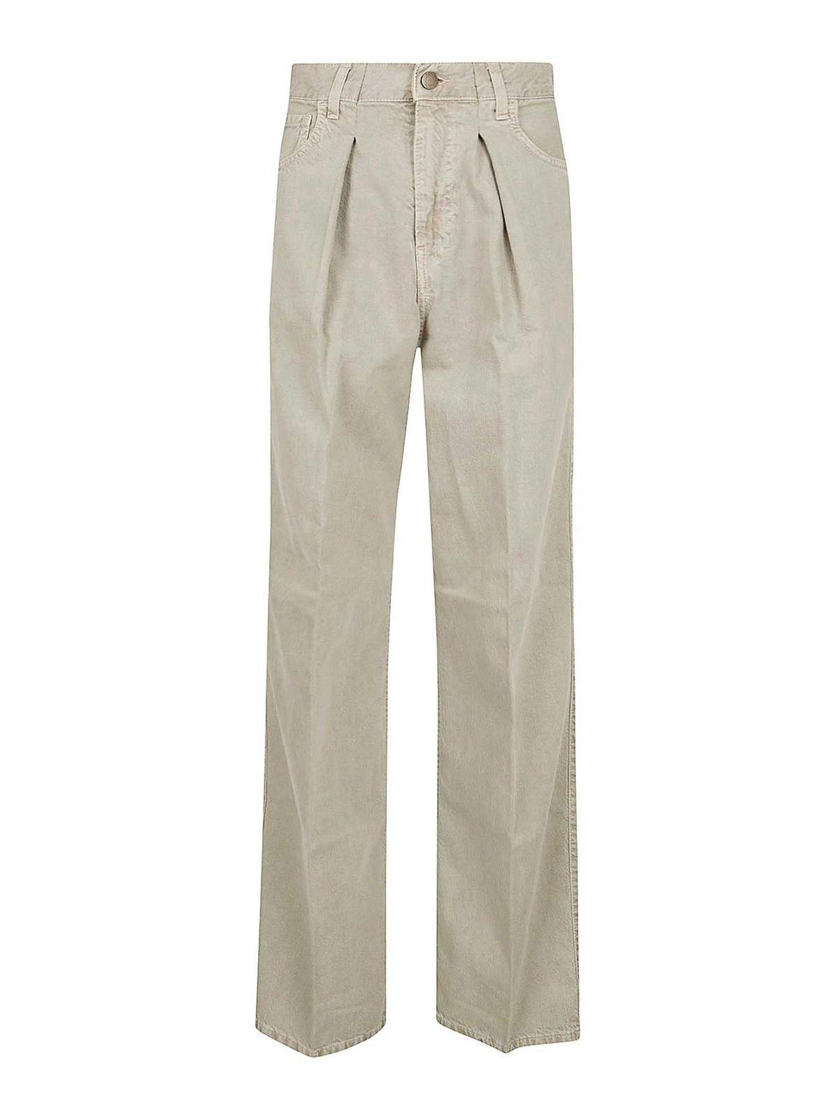 Plis sur le devant en denim beige, jambe large, passants de ceinture classiques, cinq poches