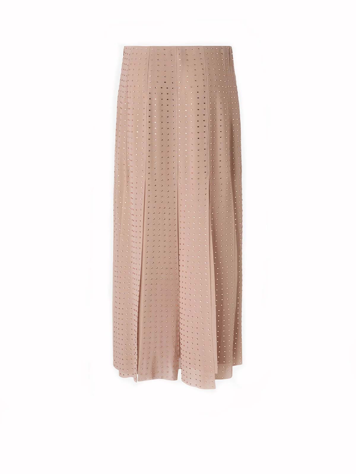 Jupe midi Pinko en tissu georgette à la finition mate raffinée, ornée de strass scintillants sur toute la surface, doublée, fermeture latérale avec fermeture éclair invisible.