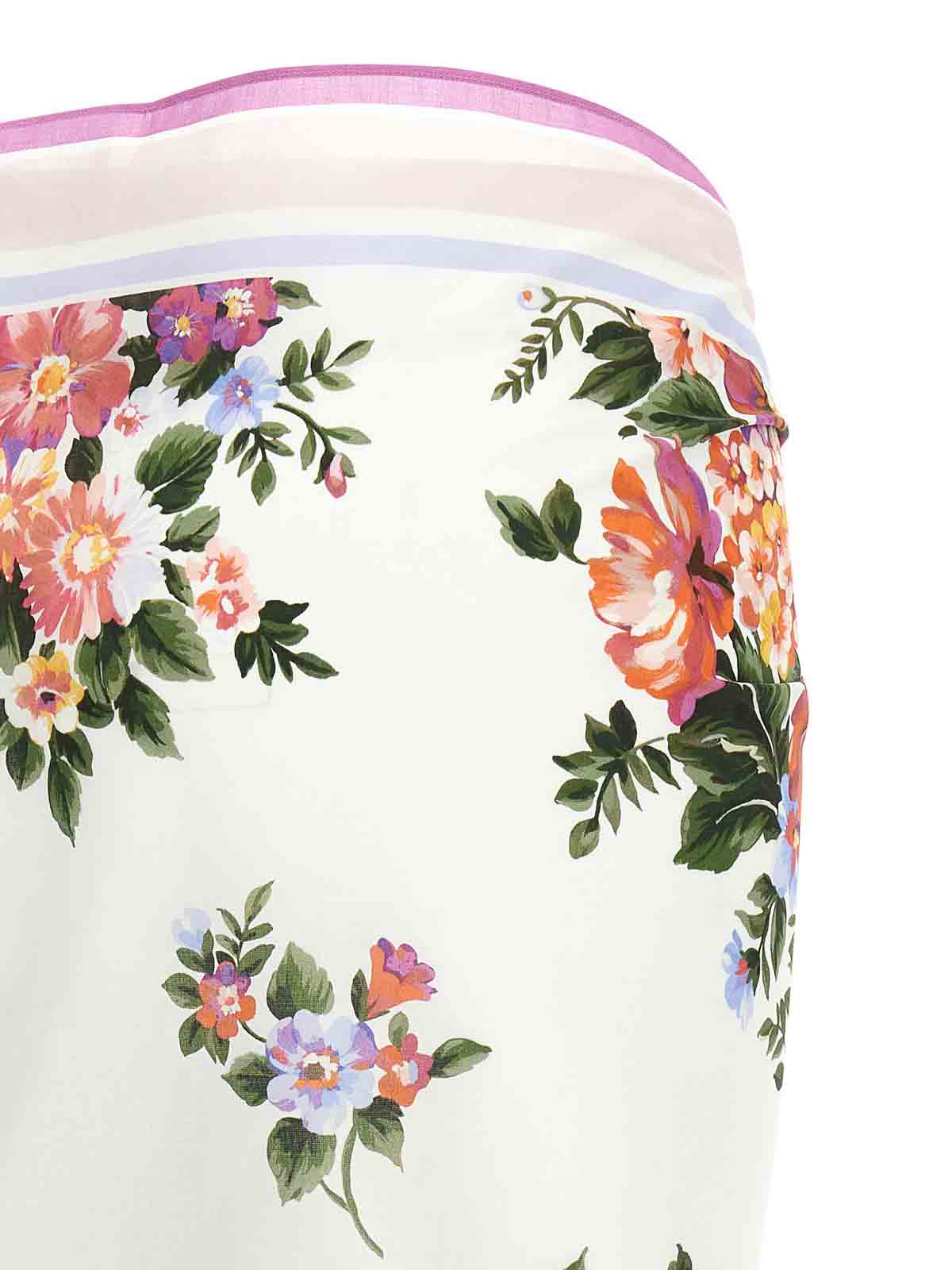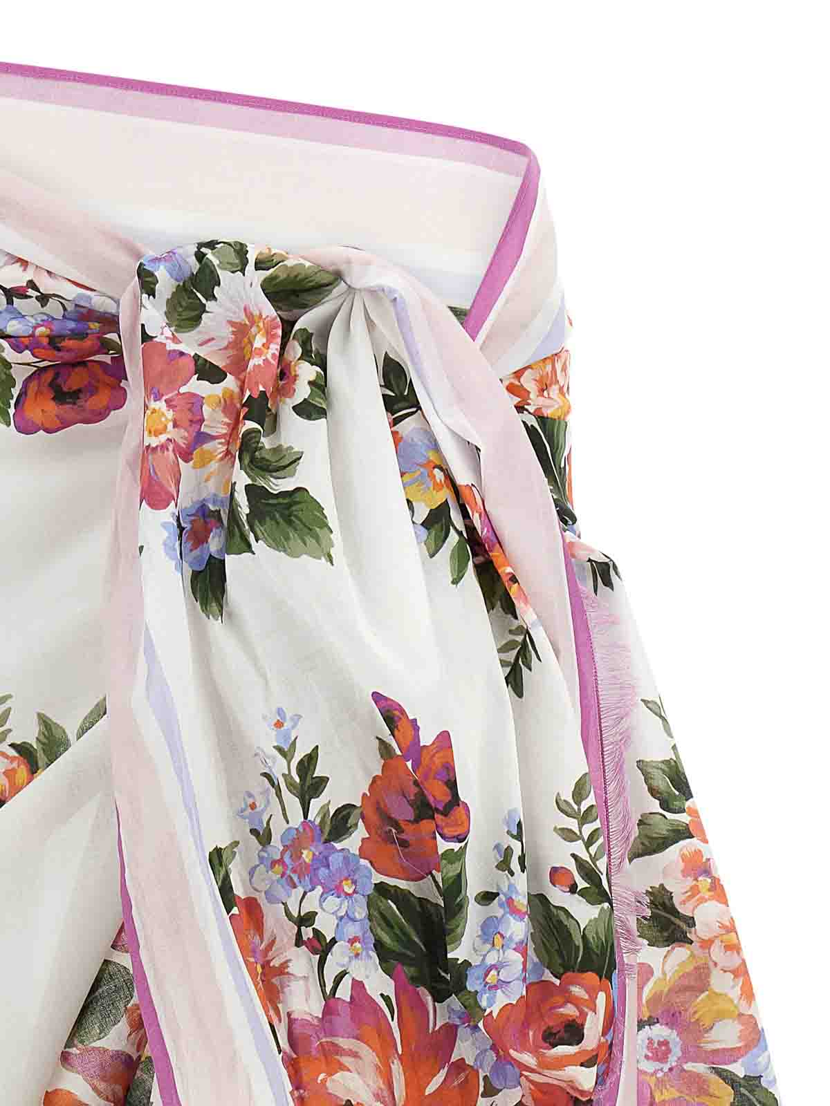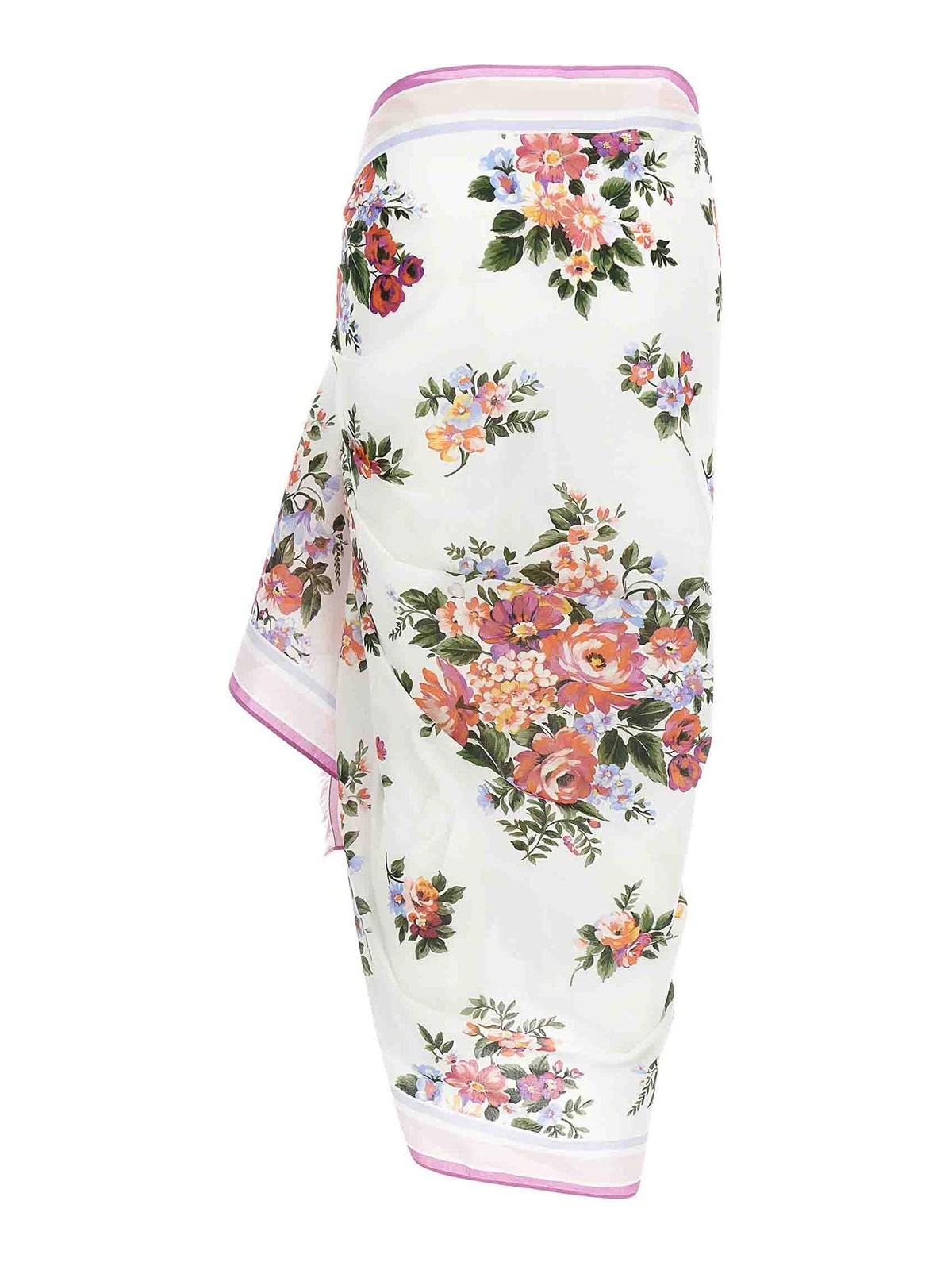 Jupe batista en coton avec imprimé « bouquet » intégral, style paréo, bords frangés.