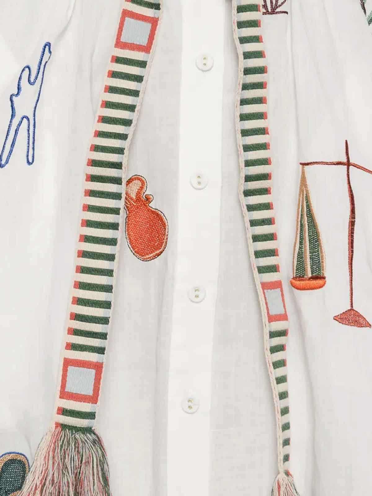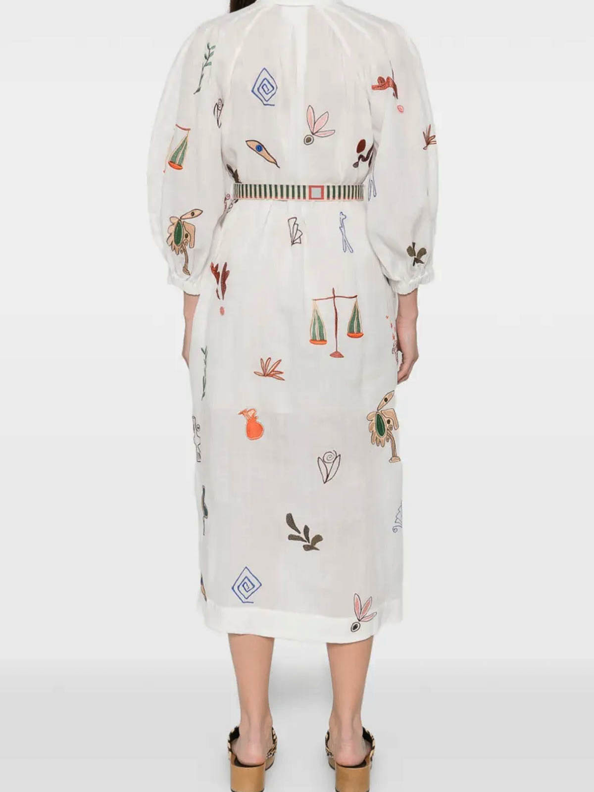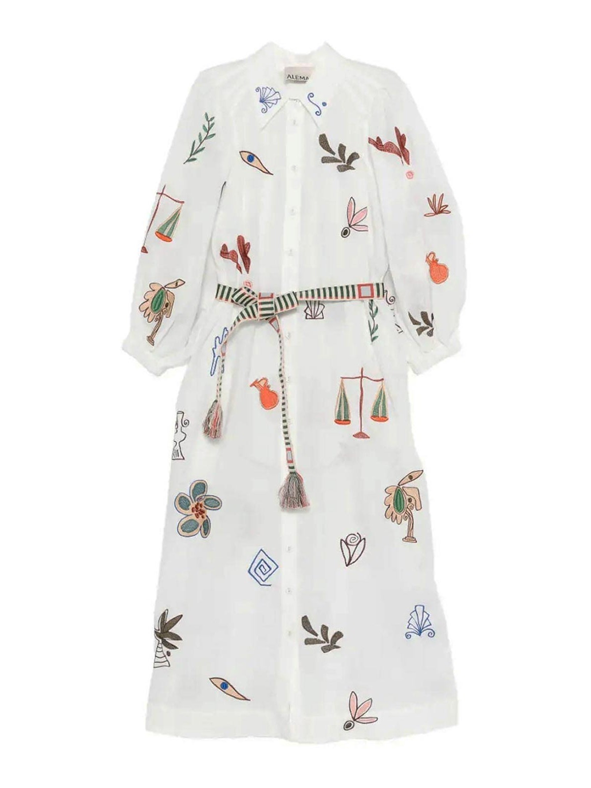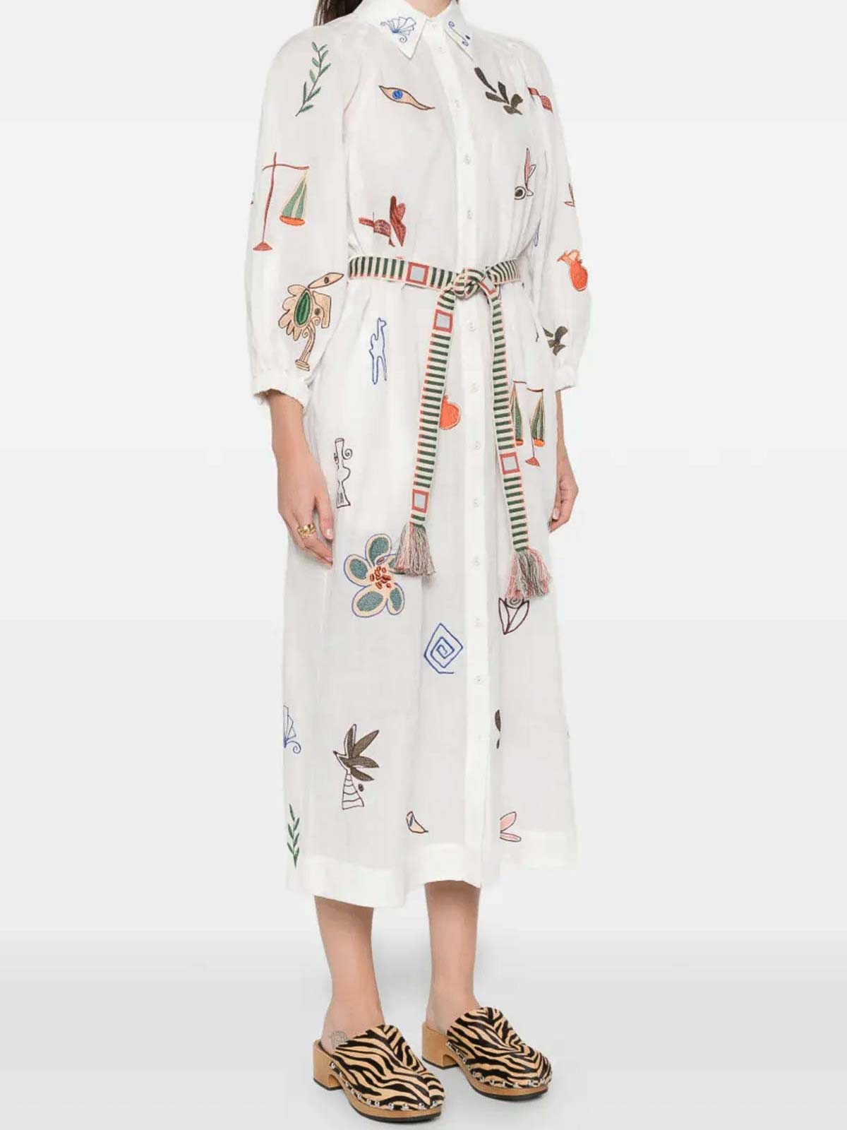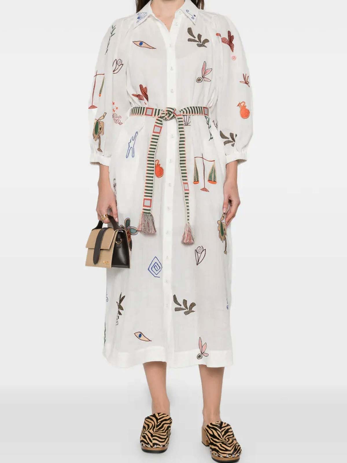 Style robe-chemise, motifs brodés, col, manches longues, fermeture boutonnée sur le devant avec boutons recouverts, poignets élastiqués, ceinture jacquard incluse, longueur au-dessus de la cheville.