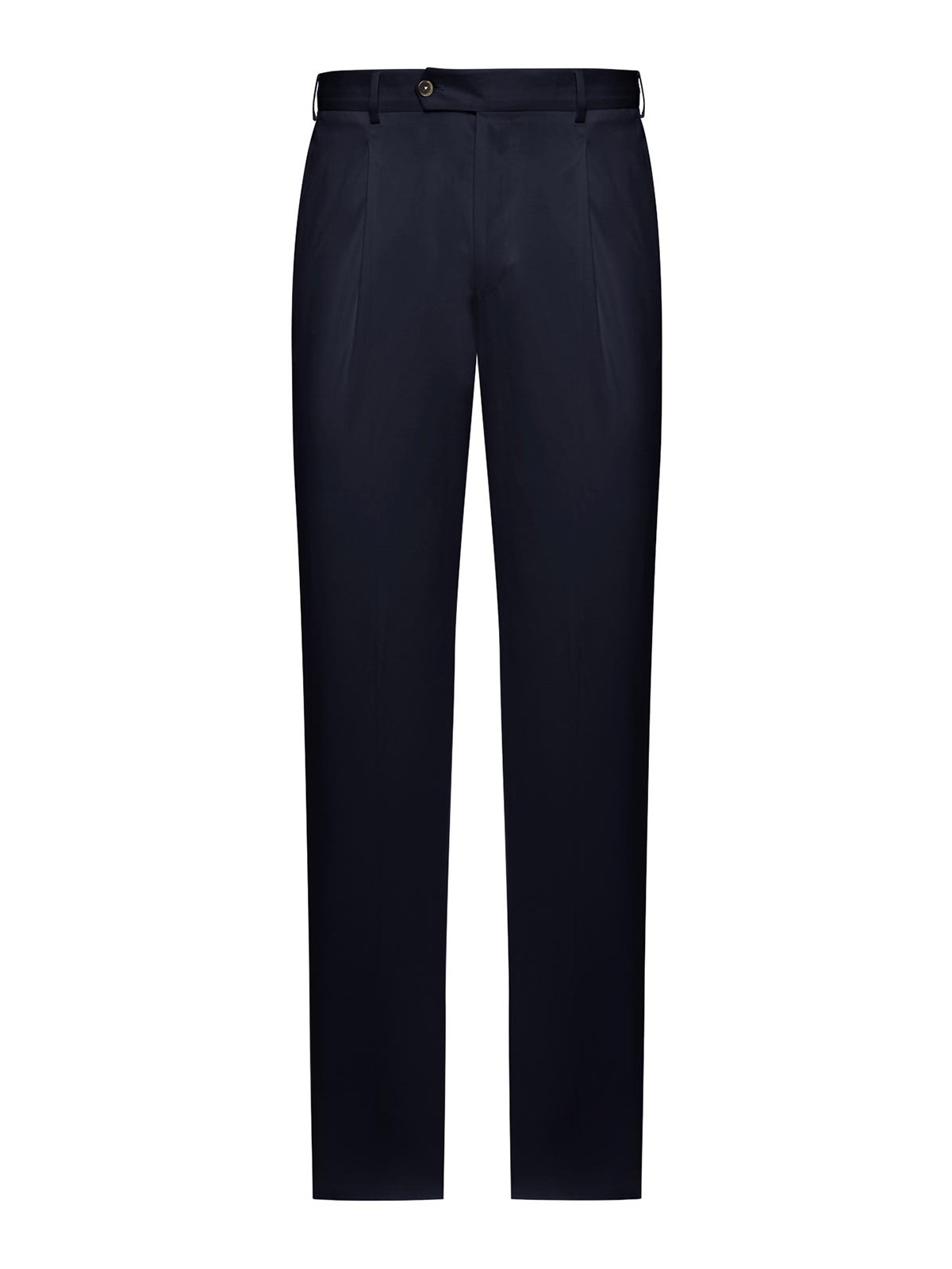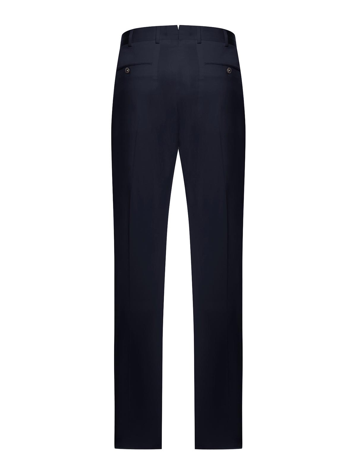 passants de ceinture à la taille, bouton sur le devant et fermeture à glissière dissimulée, pinces sur le devant, poches latérales inclinées, poches arrière passepoilées avec bouton, pli pressé le long de la jambe, jambe droite, coupe classique, coton et soie mélangés, couleur : bleu marine