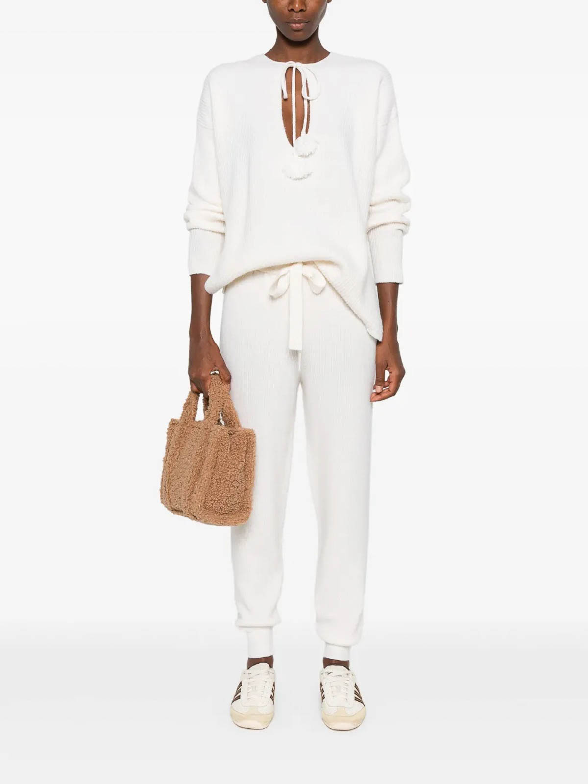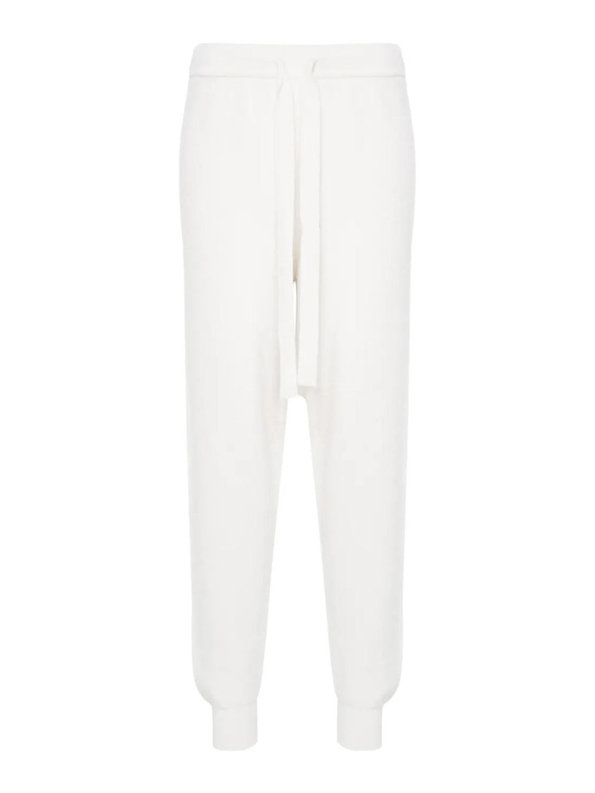 Tricot côtelé blanc crème de créateur, effet brossé, jambes fuselées, cordon de serrage élastiqué, ceinture, plaque logo