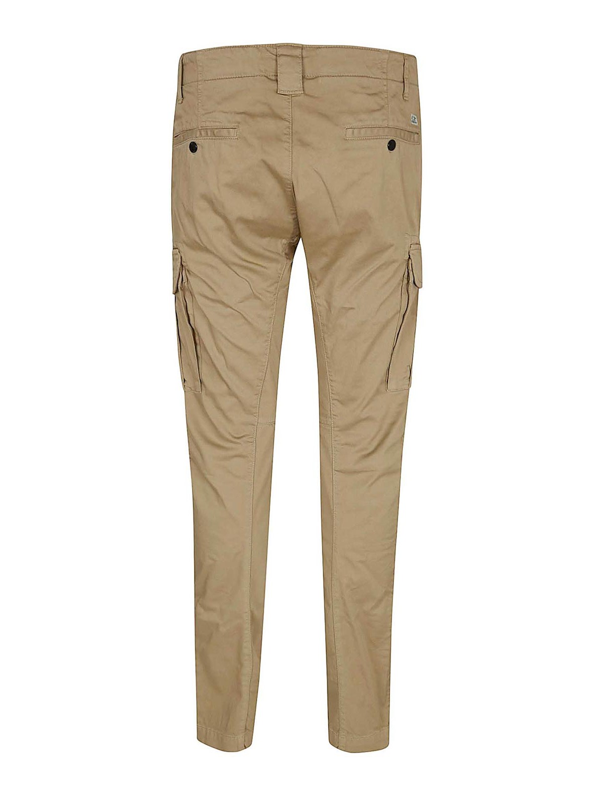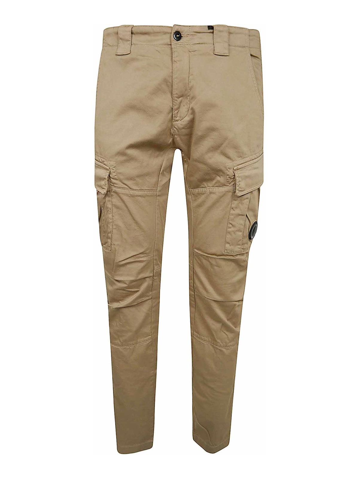 Pantalon en satin stretch de CP Company avec bouton et fermeture éclair, passants de ceinture, poches latérales et poches arrière ouvertes, coupe ergonomique, modèle cargo avec poches à rabat et boutons-pression, poche cargo caractérisée par une lentille et une étiquette logo appliquée au dos