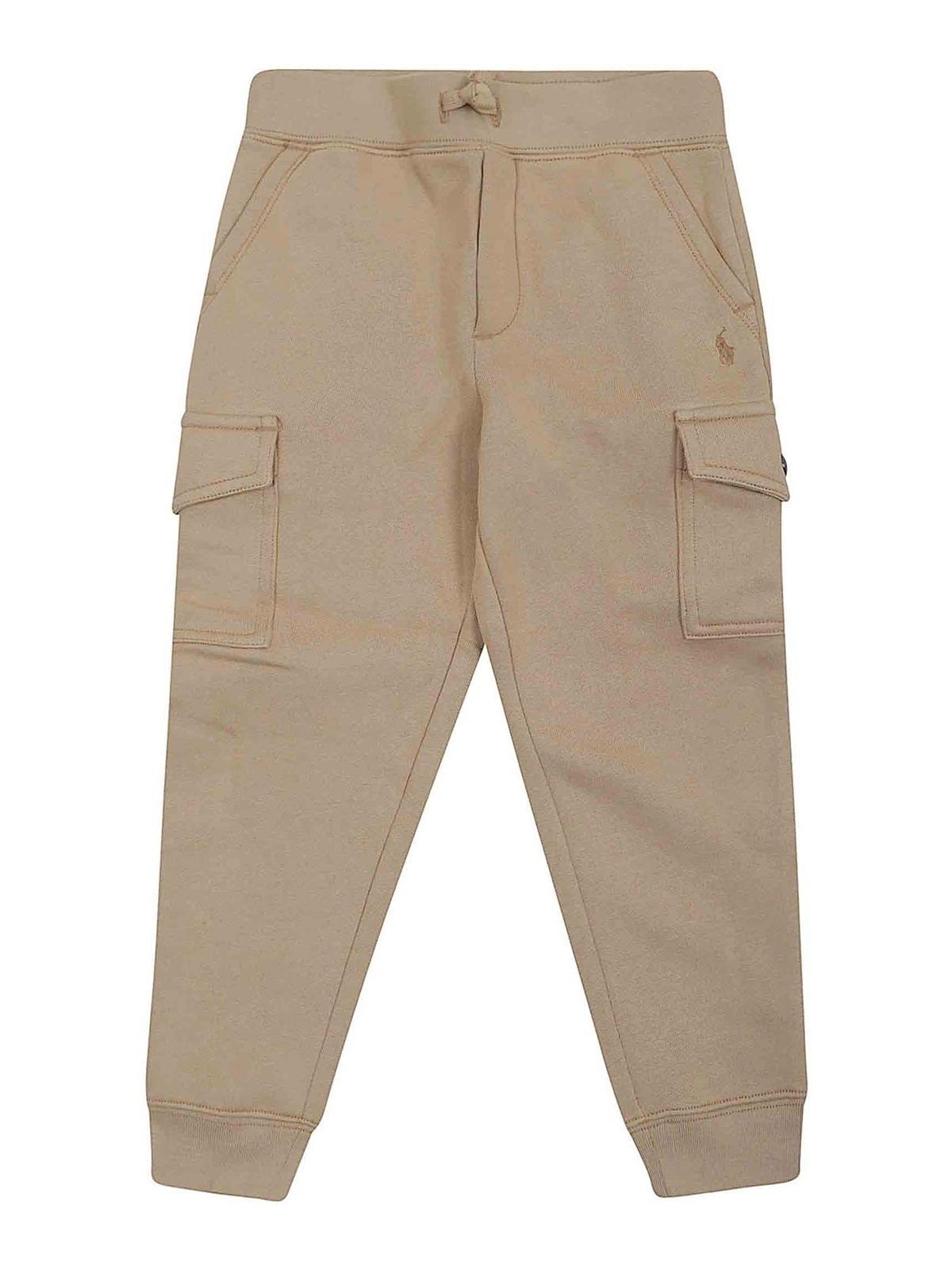 Taille élastique beige avec cordon de serrage, poches latérales, poches cargo, logo brodé, ourlet élastiqué.