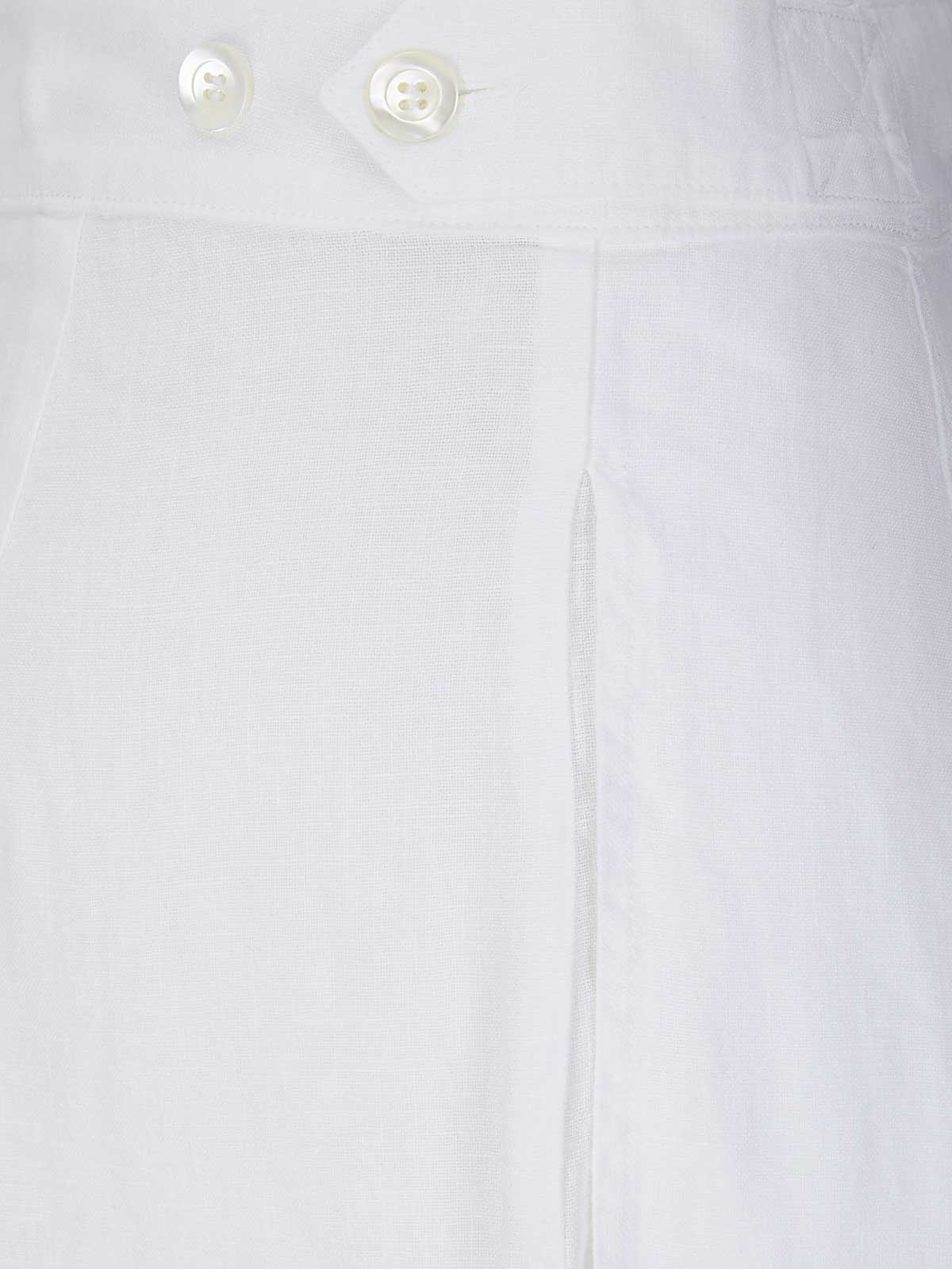 Pantalon en lin, fermeture zippée et boutonnée, deux poches passepoilées latérales, jambe large.