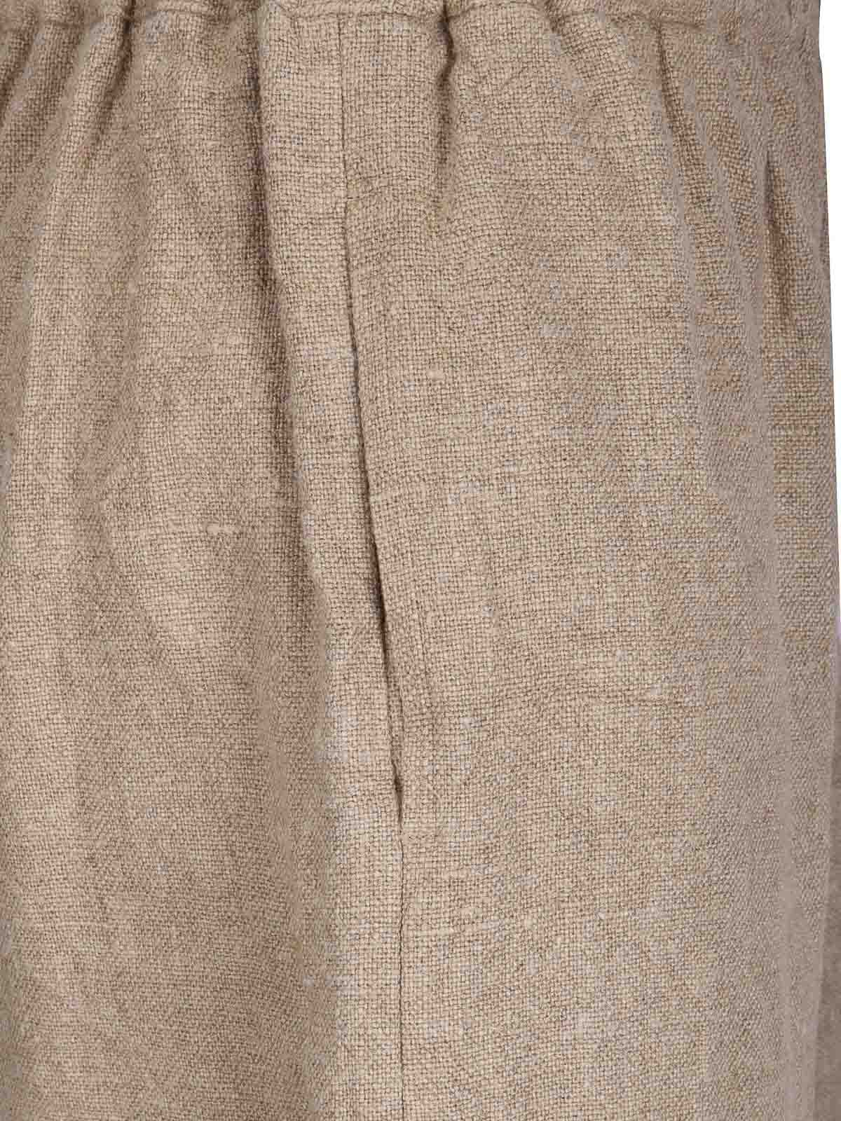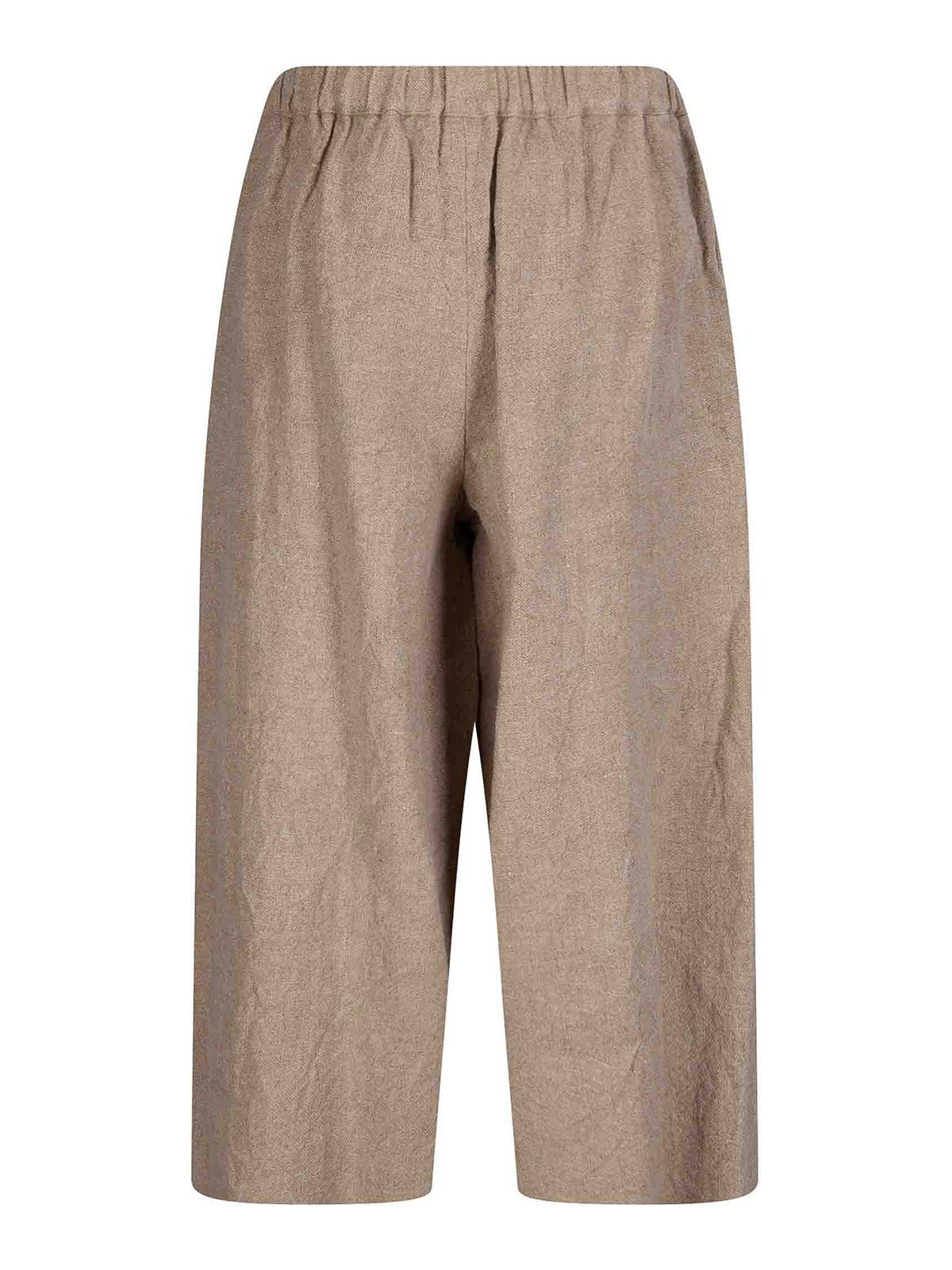 Pantalon en lin à jambe droite et court, taille élastiquée, tissu épais et rugueux.