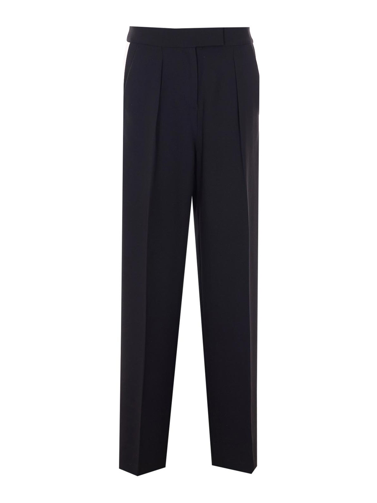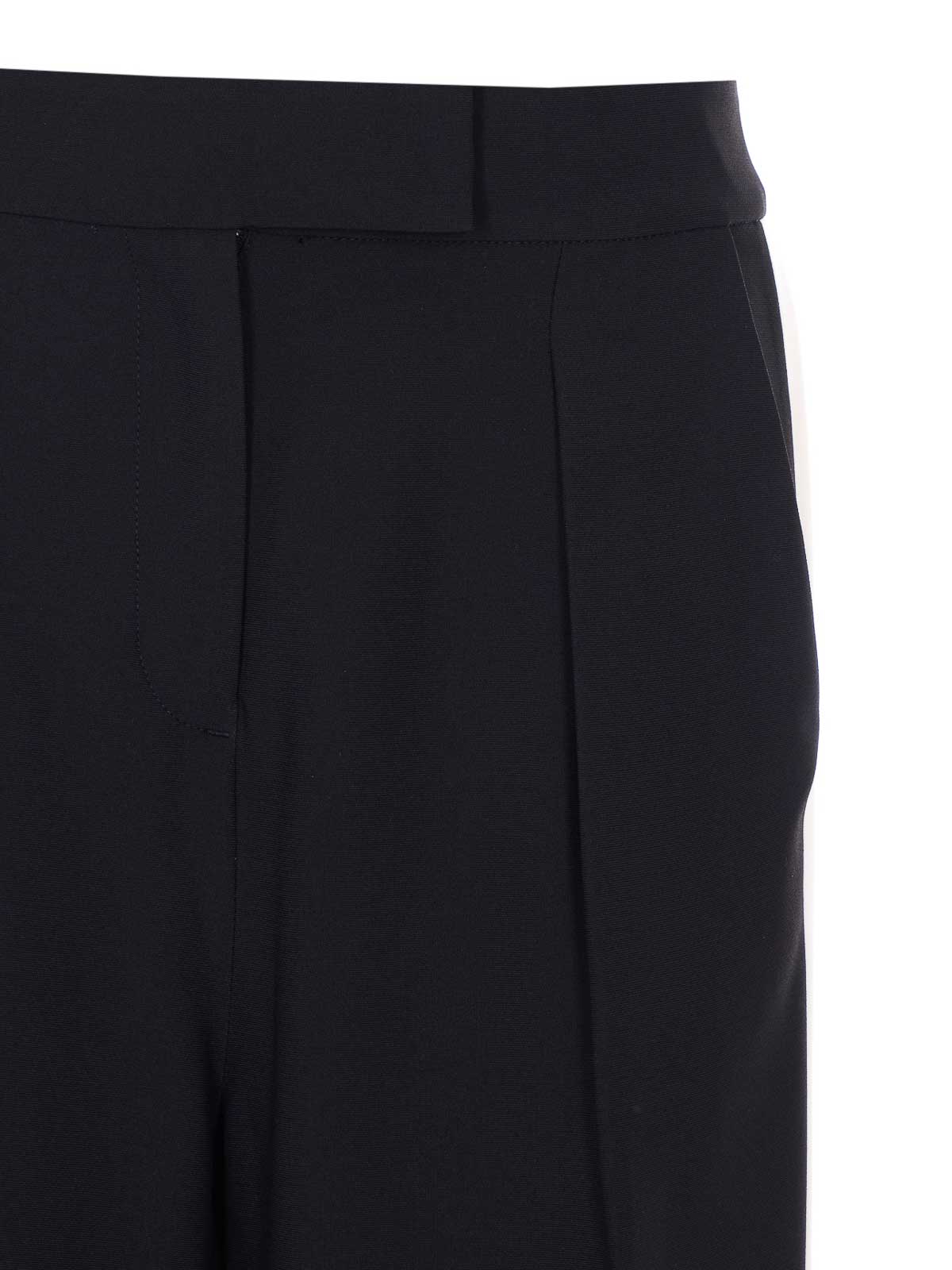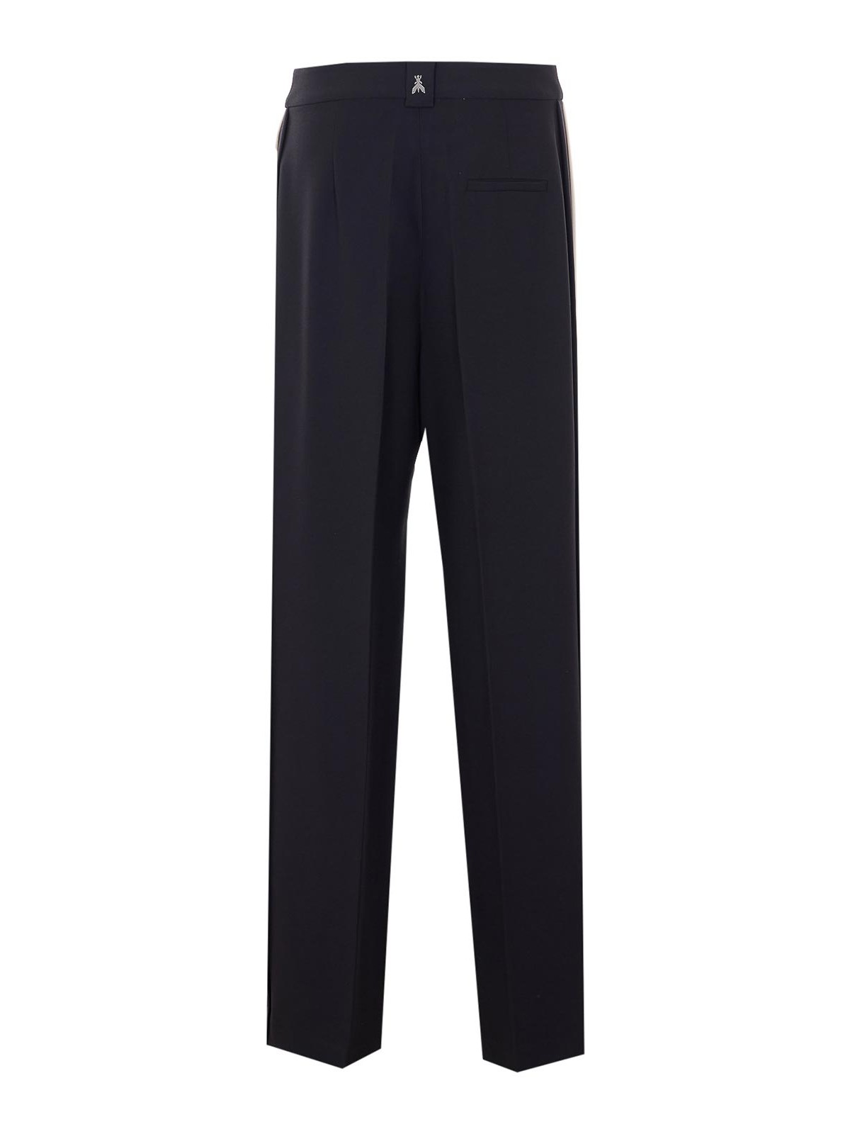 Pantalon noir Patrizia Pepe, fermeture zippée, fermeture à crochets et boutons, poches latérales, jambe large, bande sur le côté