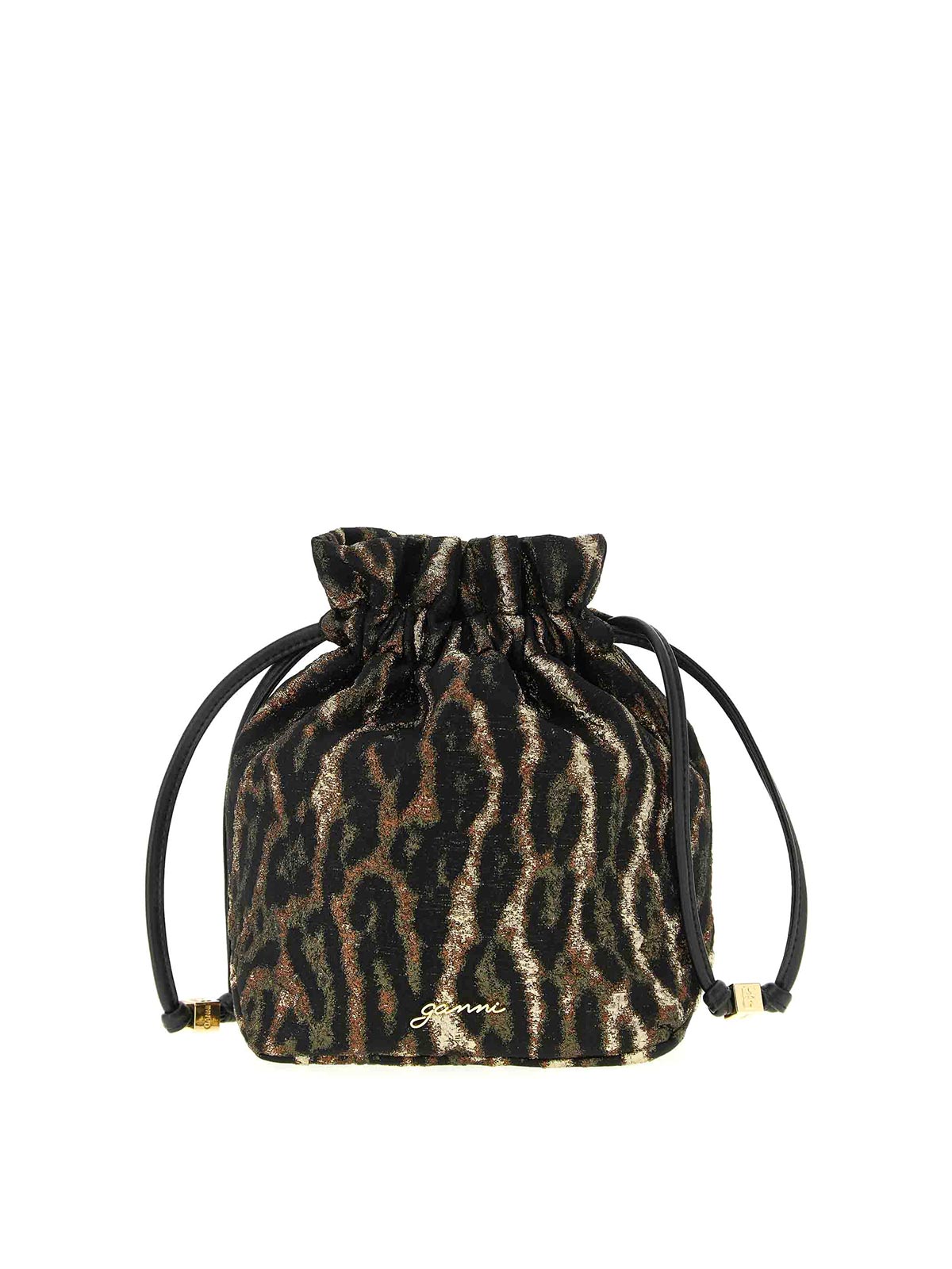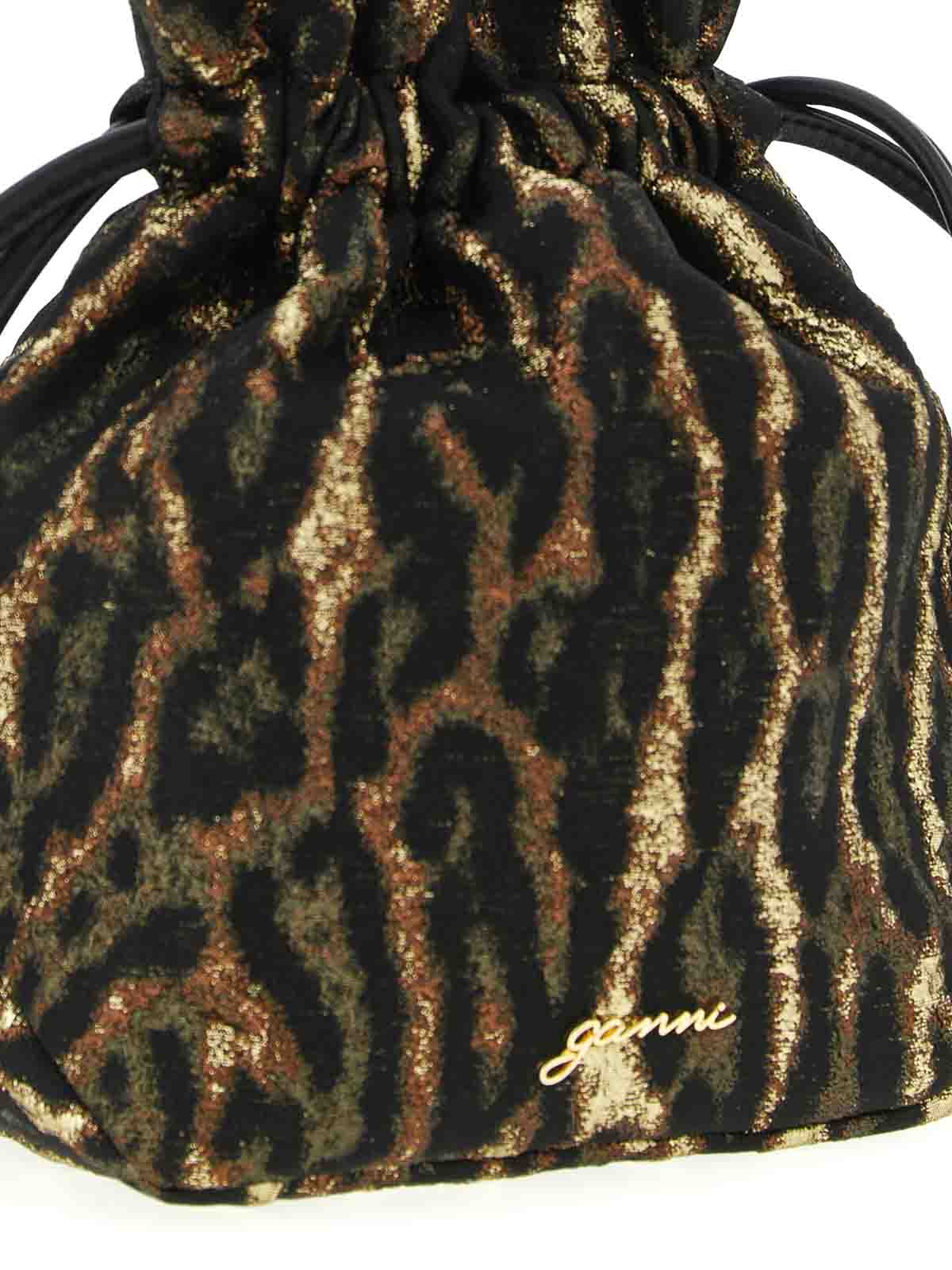 pochette « seau à bou » métallique en jacquard avec imprimé animalier à effet métallisé, fermeture à cordon et logo en forme de papillon Ganni en métal.