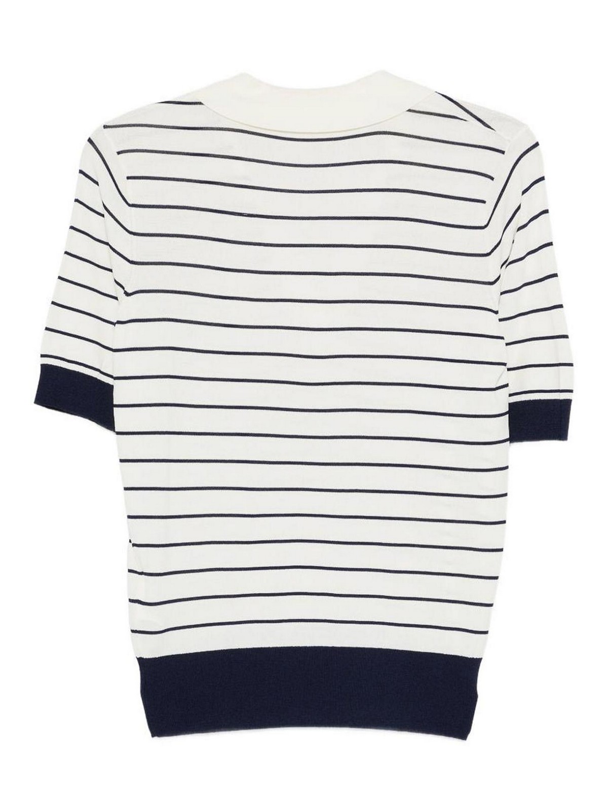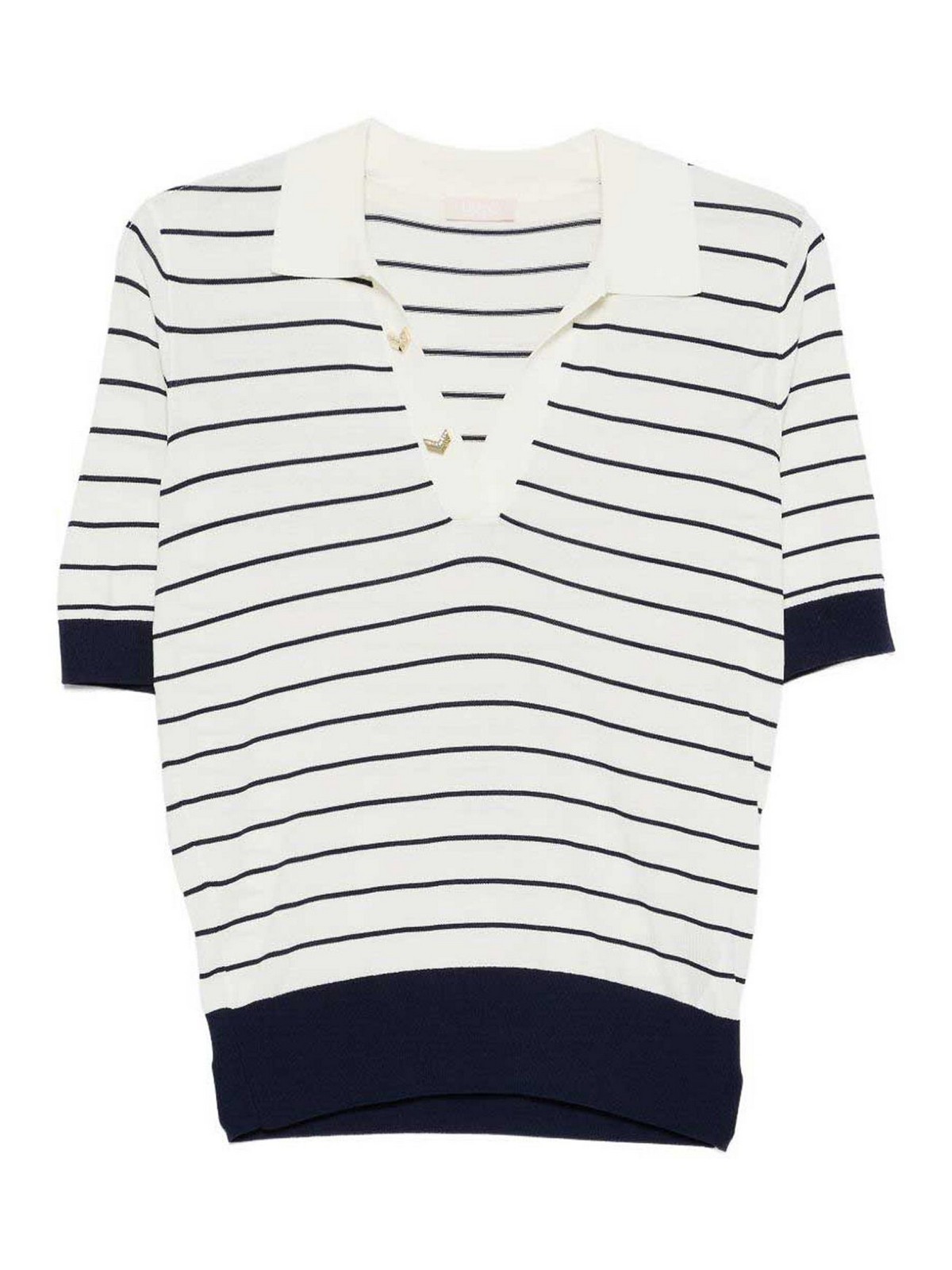 Le t-shirt polo blanc pour femme de Liu Jo est une pièce polyvalente et contemporaine. fabriqué à partir de tissus de haute qualité, il présente de fines rayures bleues et un col en V, alliant style sport-chic et élégance féminine. parfait à porter avec un jean, un pantalon ou une jupe, il offre confort et le design distinctif caractéristique de Liu Jo.