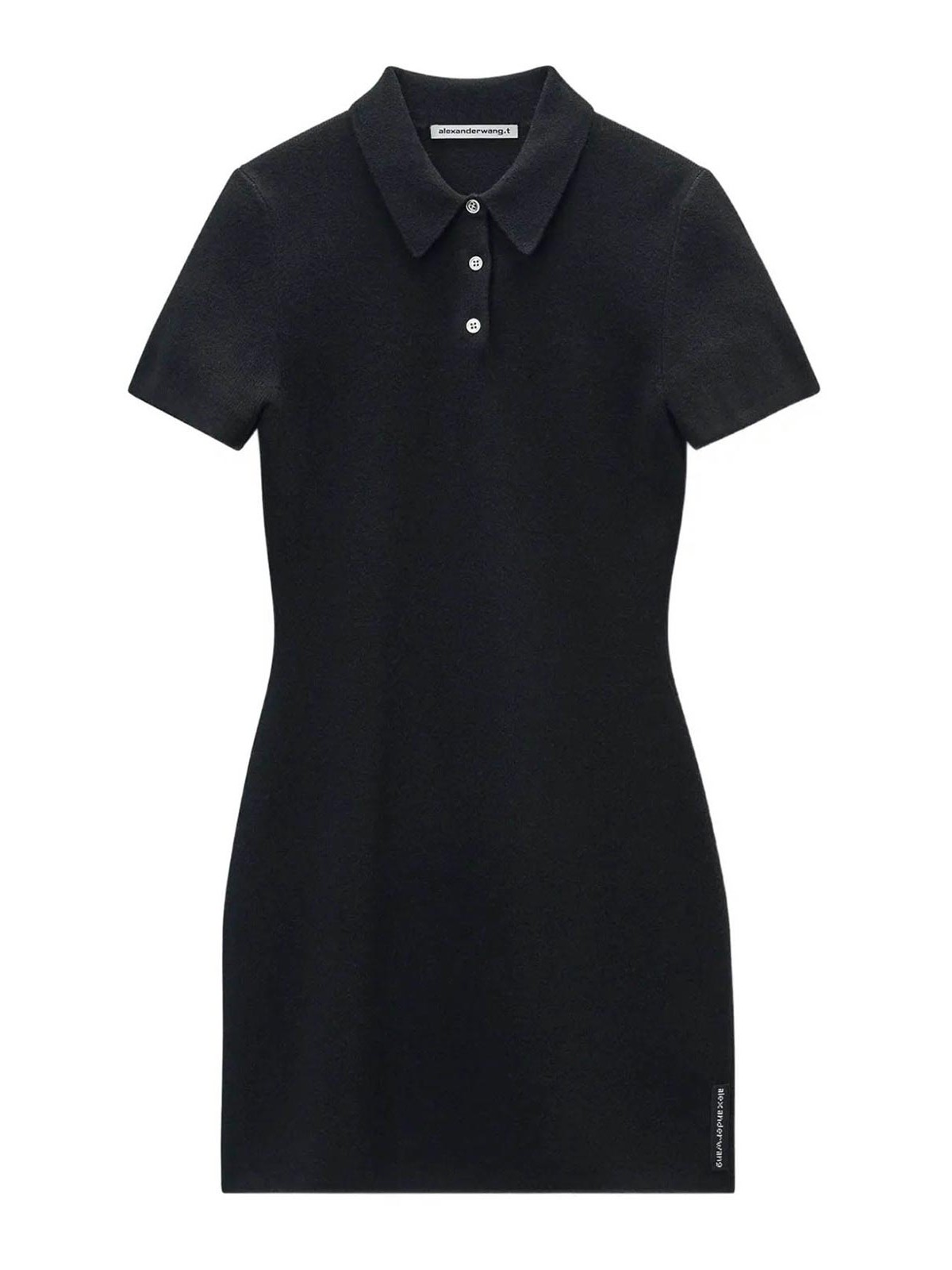 Ce polo en laine présente des manches courtes et une silhouette épurée et ajustée, un col côtelé en maille unie, des boutons siglés sur la patte de boutonnage centrale et une version tricotée de l'étiquette du drapeau alexanderwang sur l'ourlet inférieur. Col style polo. Composition : 88 % laine/10 % polyamide/2 % élasthanne