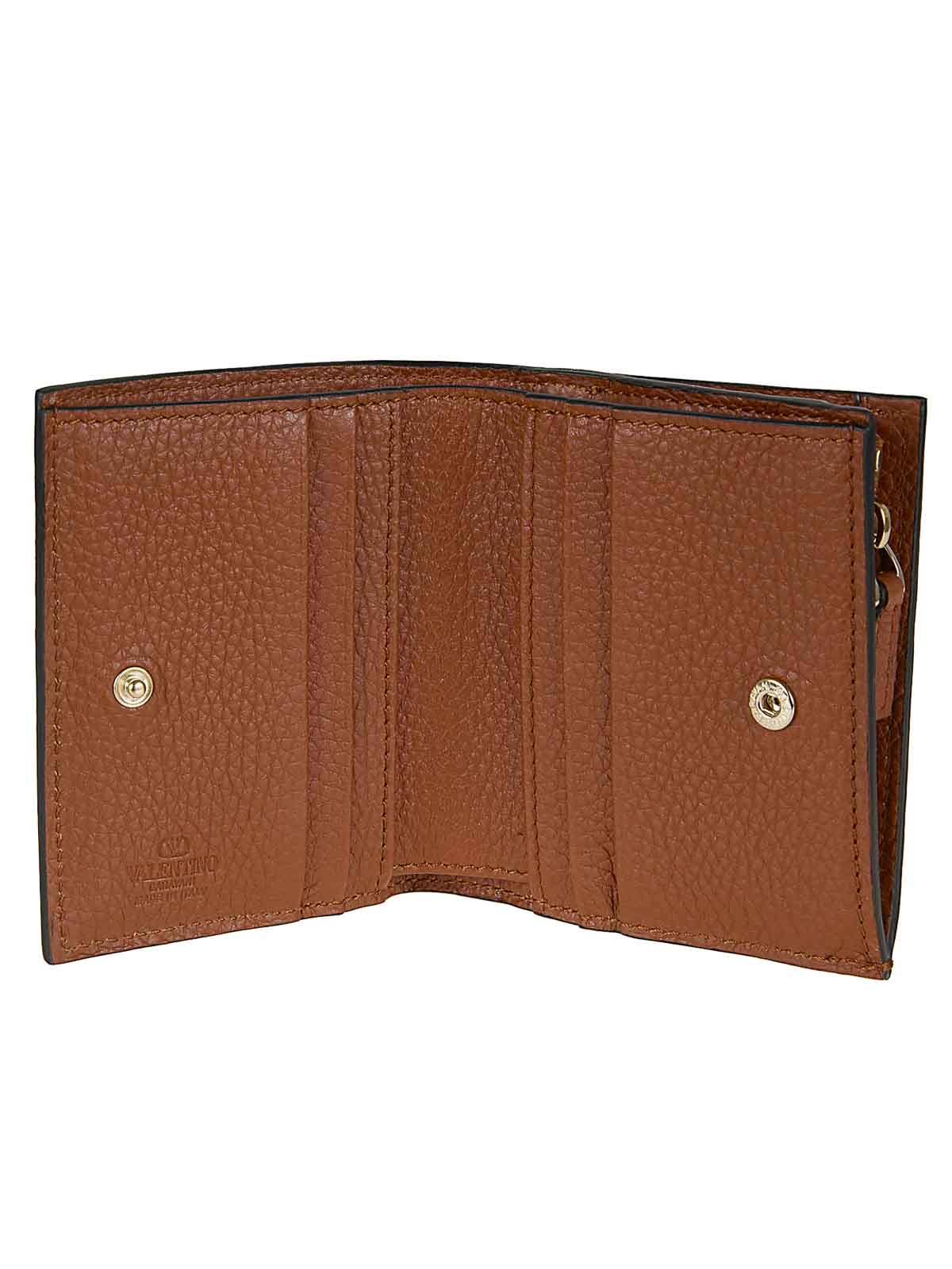 Portefeuille en cuir de veau grainé de Valentino Garavan avec bouton-pression, six emplacements pour cartes, une poche zippée pour la monnaie et une poche pour billets caractérisée par les clous caractéristiques de la marque sur le profil