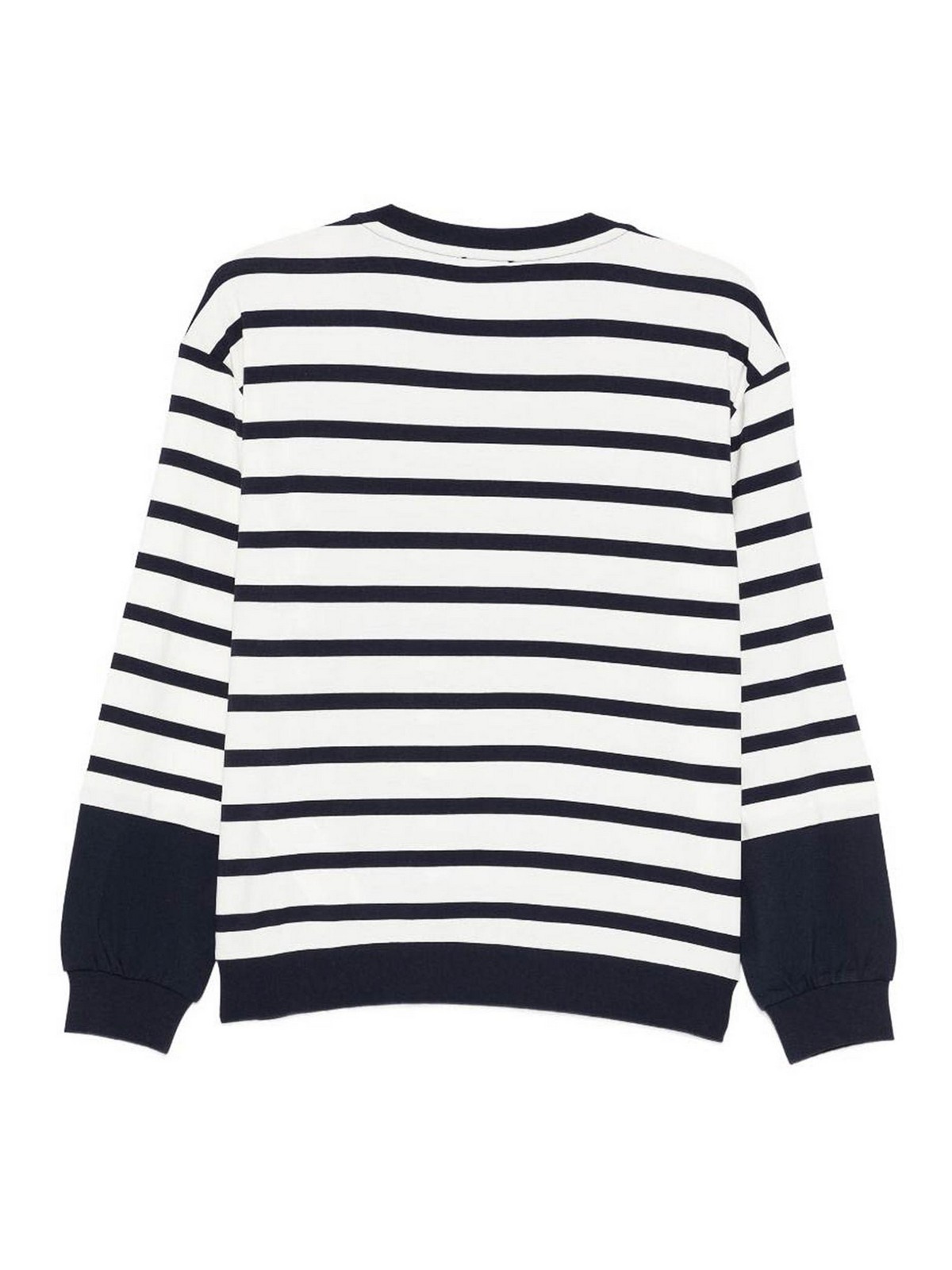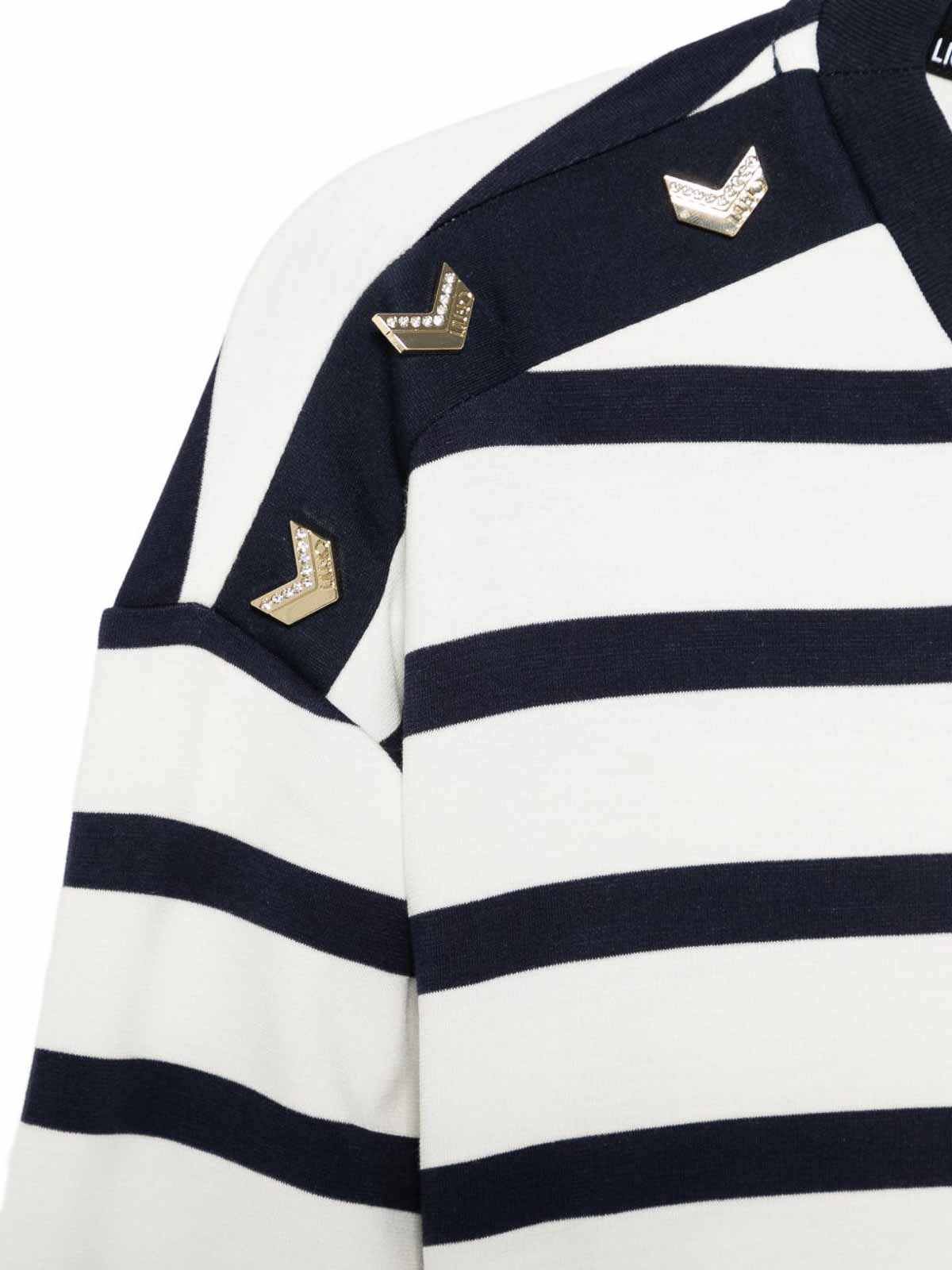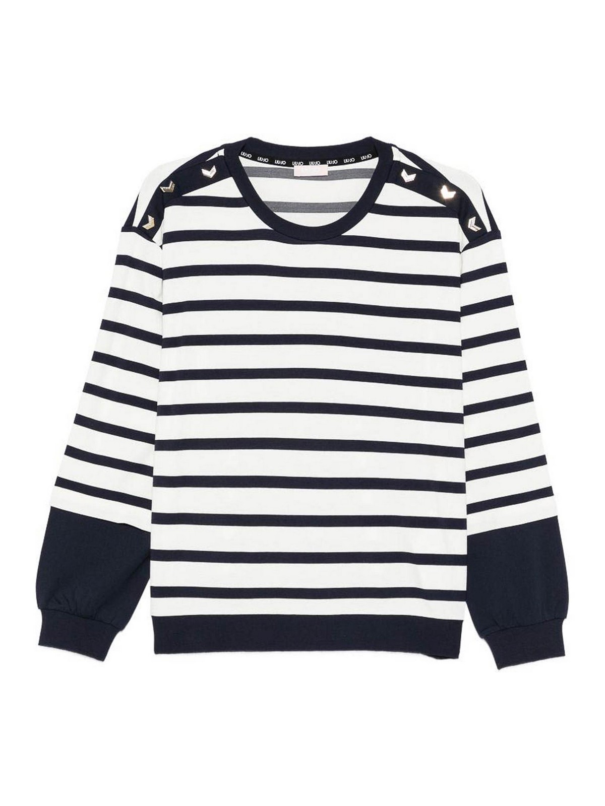 Le pull blanc à col rond à rayures bleues pour femme de Liu Jo est une pièce intemporelle au style frais et contemporain. Fabriqué dans un tissu doux et confortable, il arbore des rayures bleues classiques qui ajoutent une touche marinière raffinée.