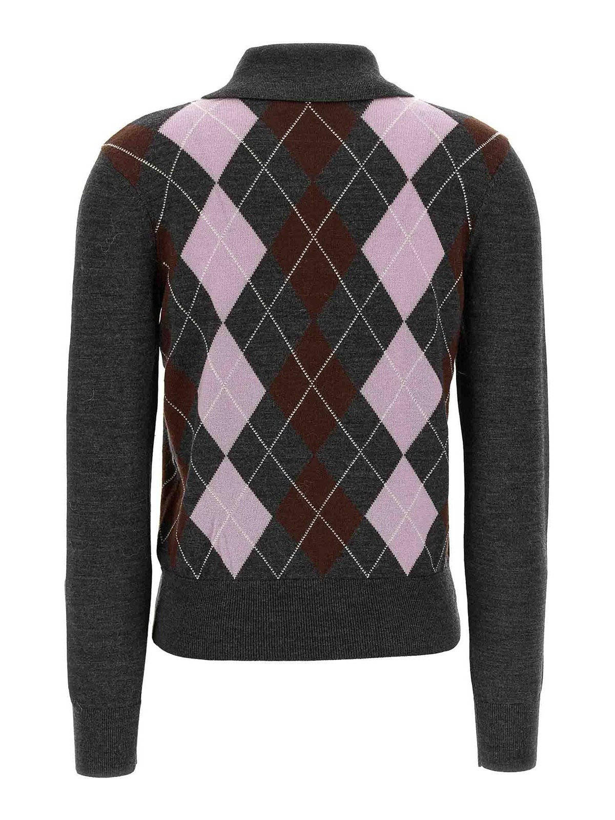 Pull léger en laine argyle gris avec broderies sur le devant et dans le dos, style polo avec col bijou et boutons, manches longues à revers.