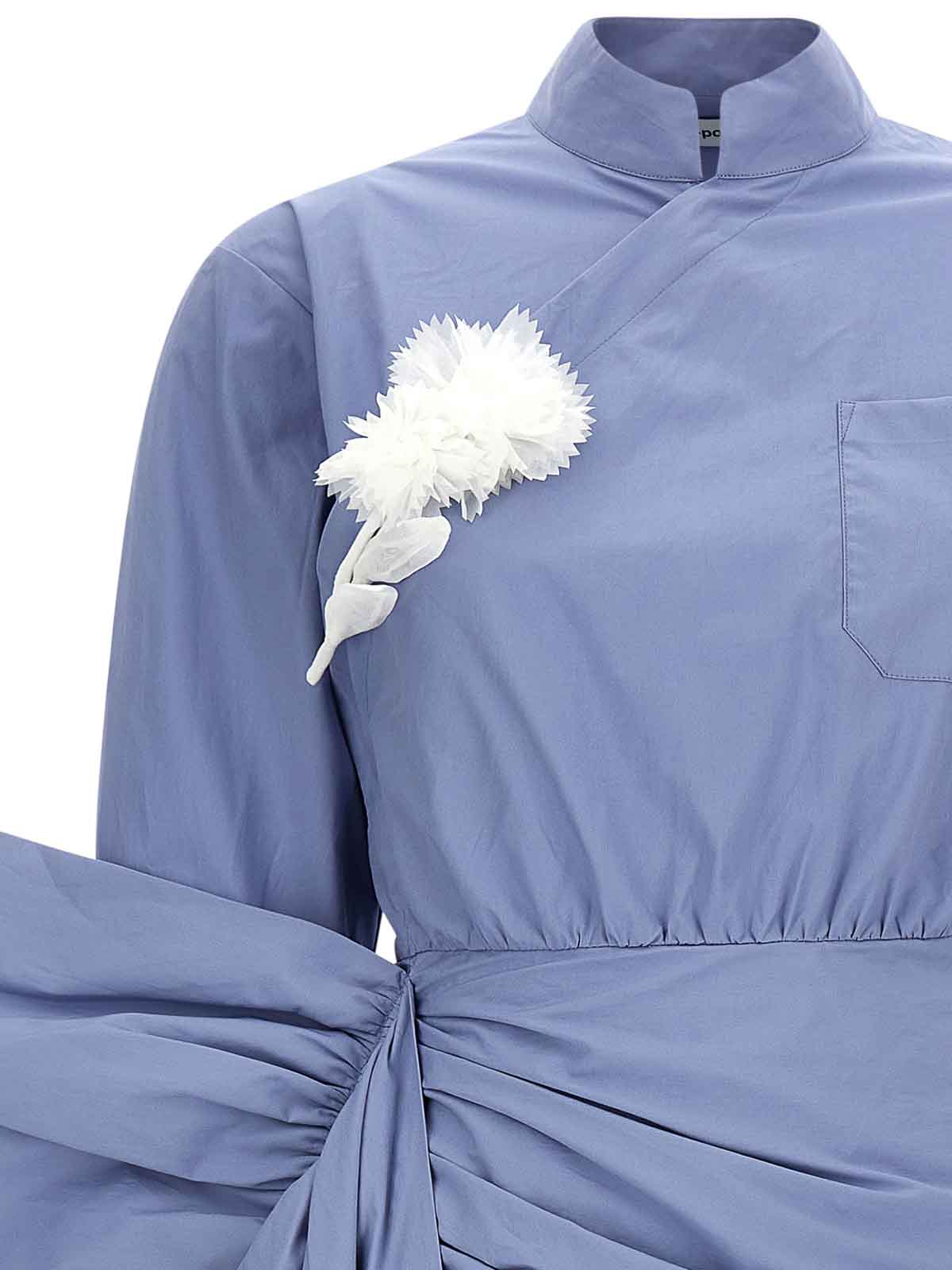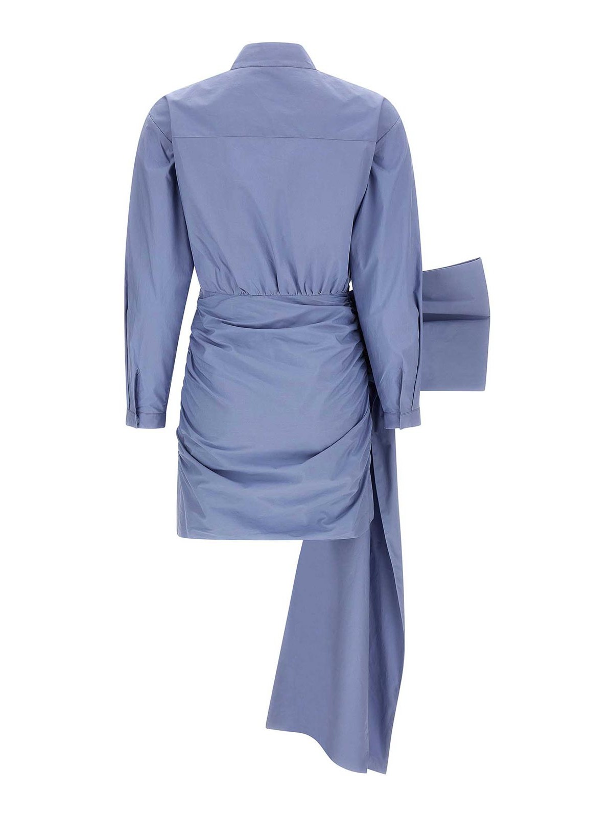 mini-robe en coton bleu à nouer sur le côté avec fermeture à bouton-pression asymétrique sur le devant, col haut, poche poitrine, broche corsage amovible, manches longues à revers, fermeture zippée latérale, jupe volantée devant et dos, maxi nœud, ourlet asymétrique.