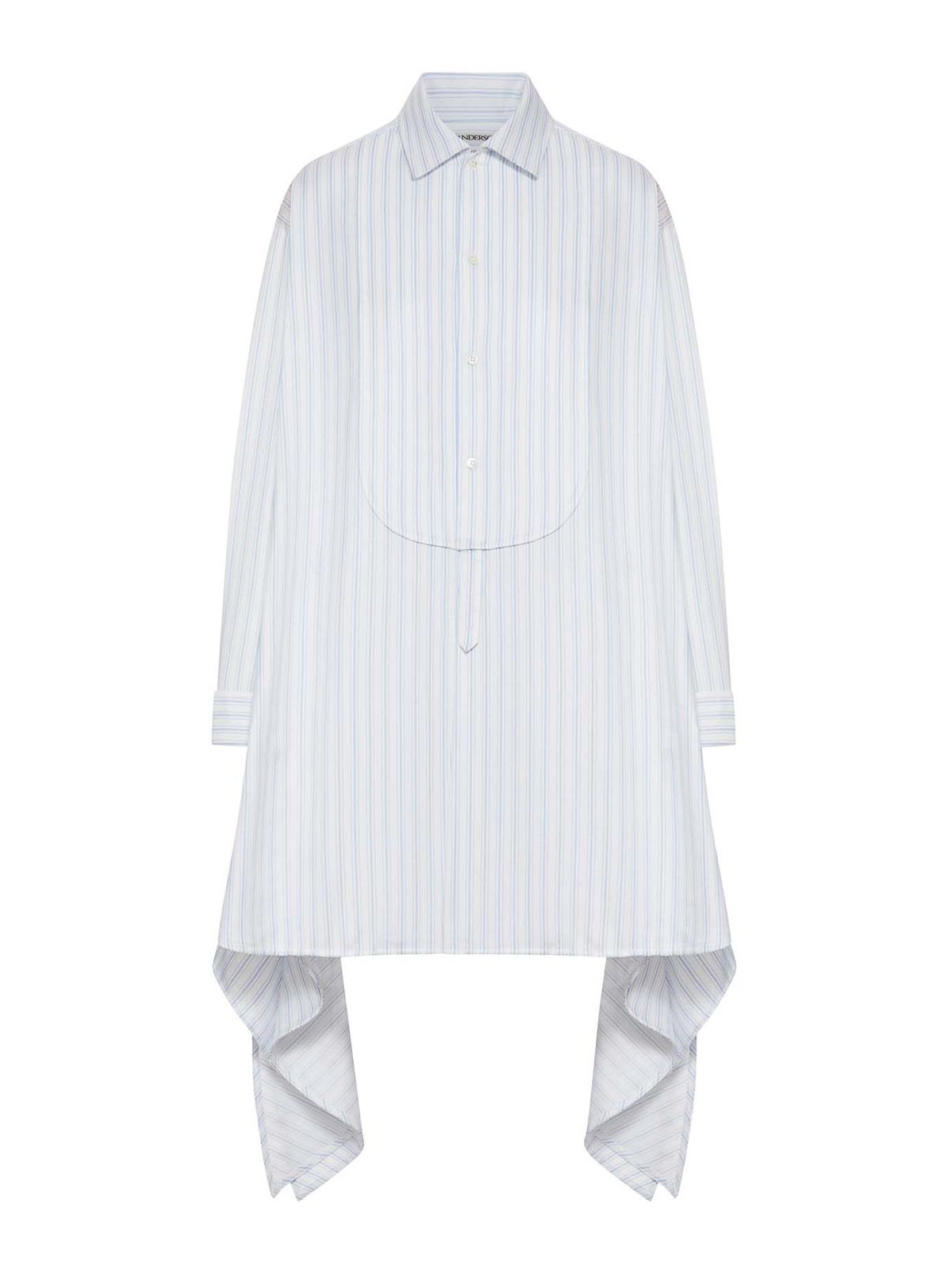 robe chemise, détails noués sur les côtés, popeline rayée blanche et bleu poudré, col classique, détail de bretelles sur le devant, orné d'une broderie d'ancre ton sur ton, surpiqûres mocassin sur le rabat des poignets, boutons en nacre, couleur : blanc/bleu