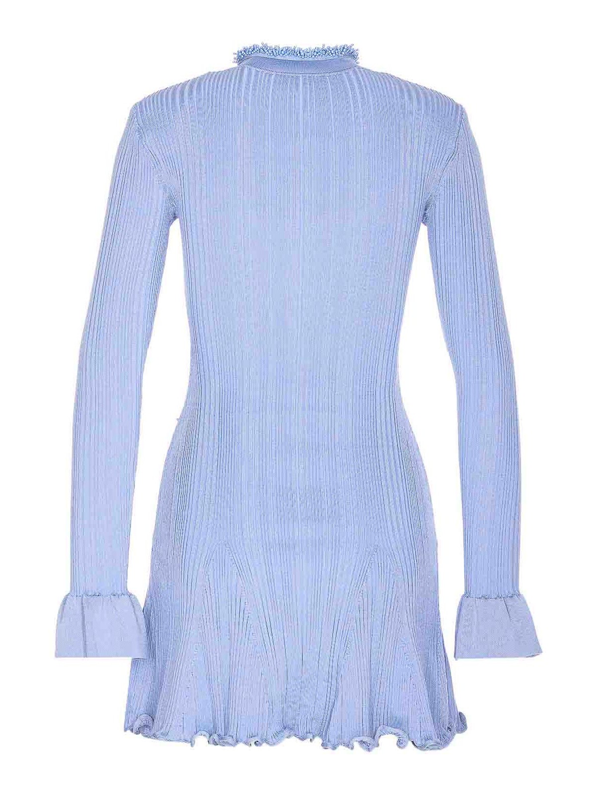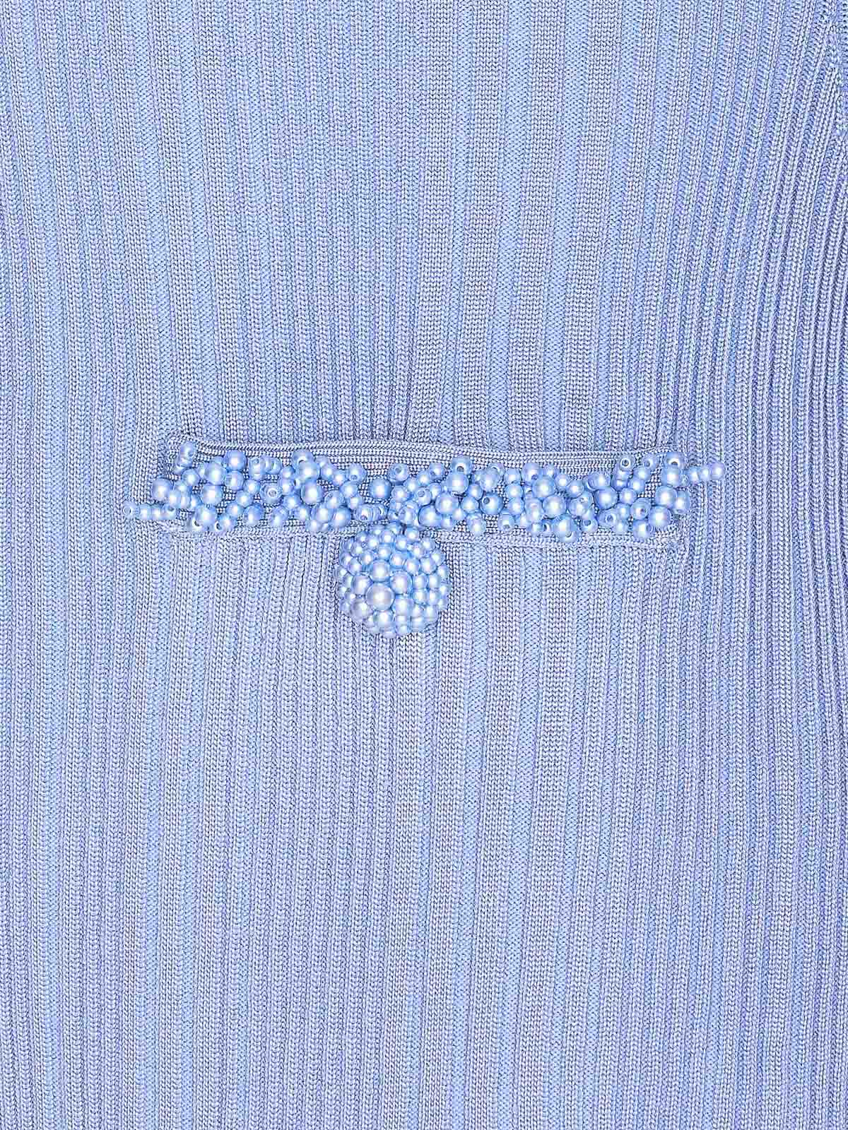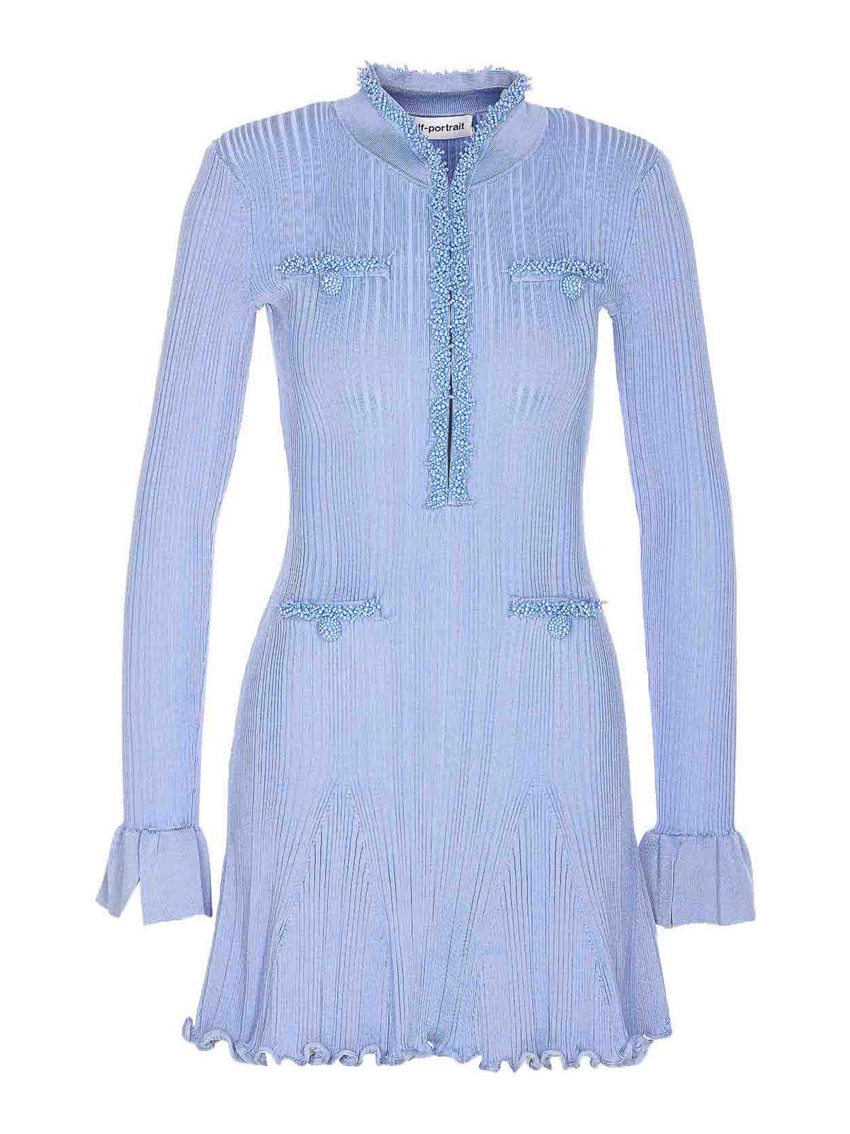 Robe autoportrait en maille bordée de perles bleues, fermeture à crochet sur le devant, détails en perles, manches longues, coupe moulante, poignets, mini-modèle