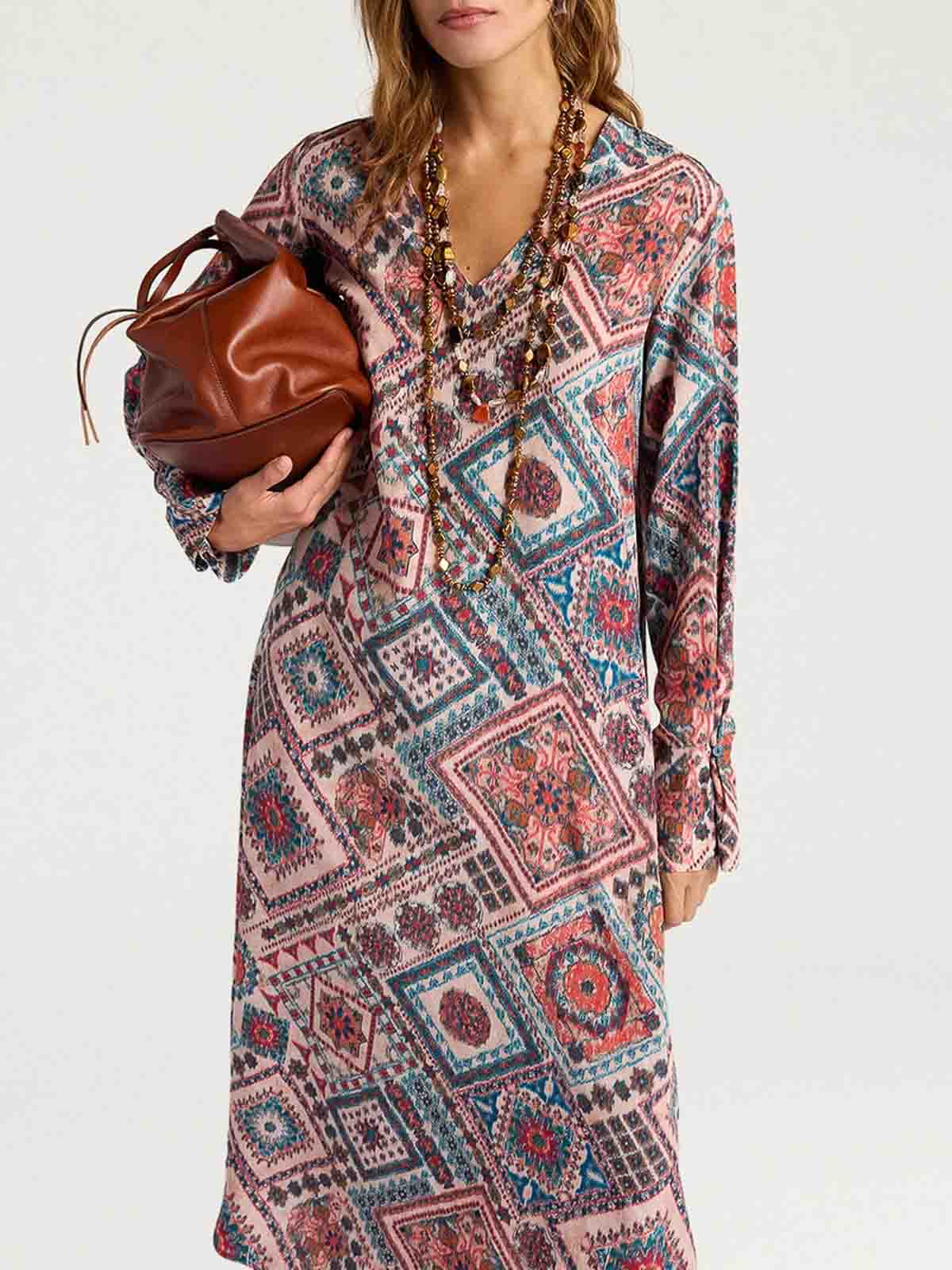 robe à la riche ligne évasée en crêpe de Chine de soie imprimée en Italie. les manches larges avec poignets, poches et col en V caractérisent l'un des volumes les plus emblématiques de l'héritage momon.