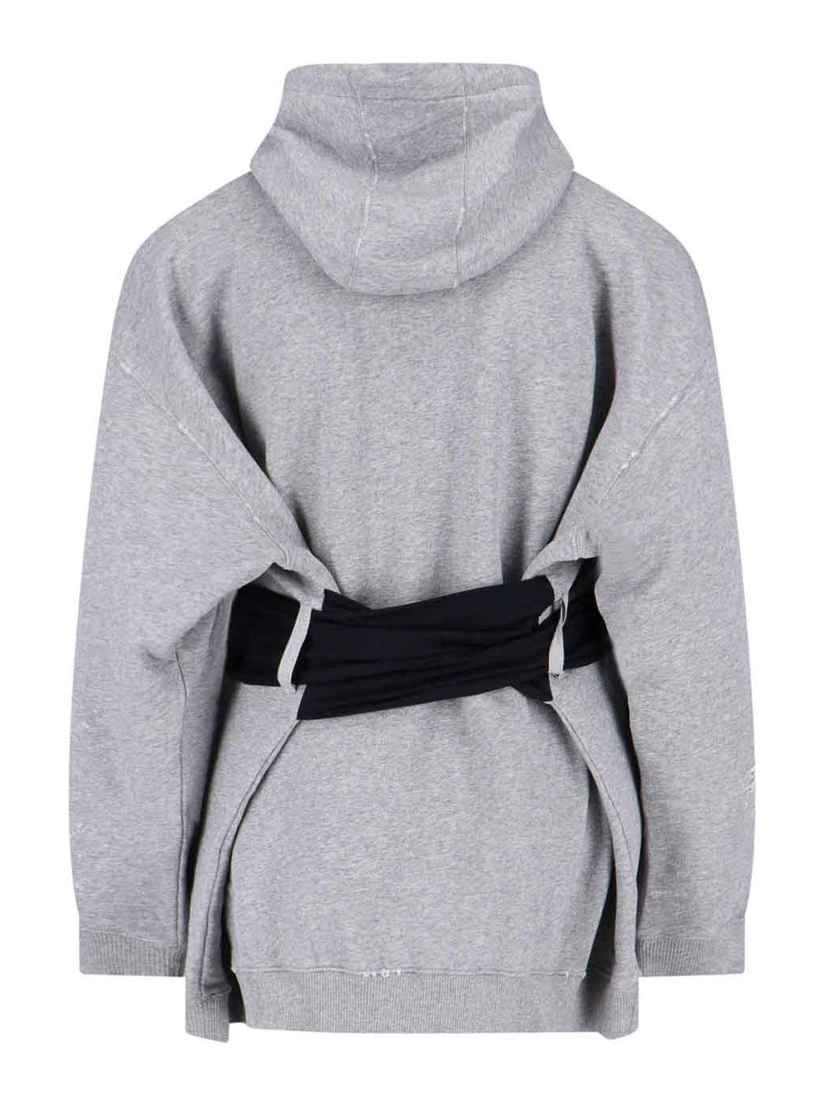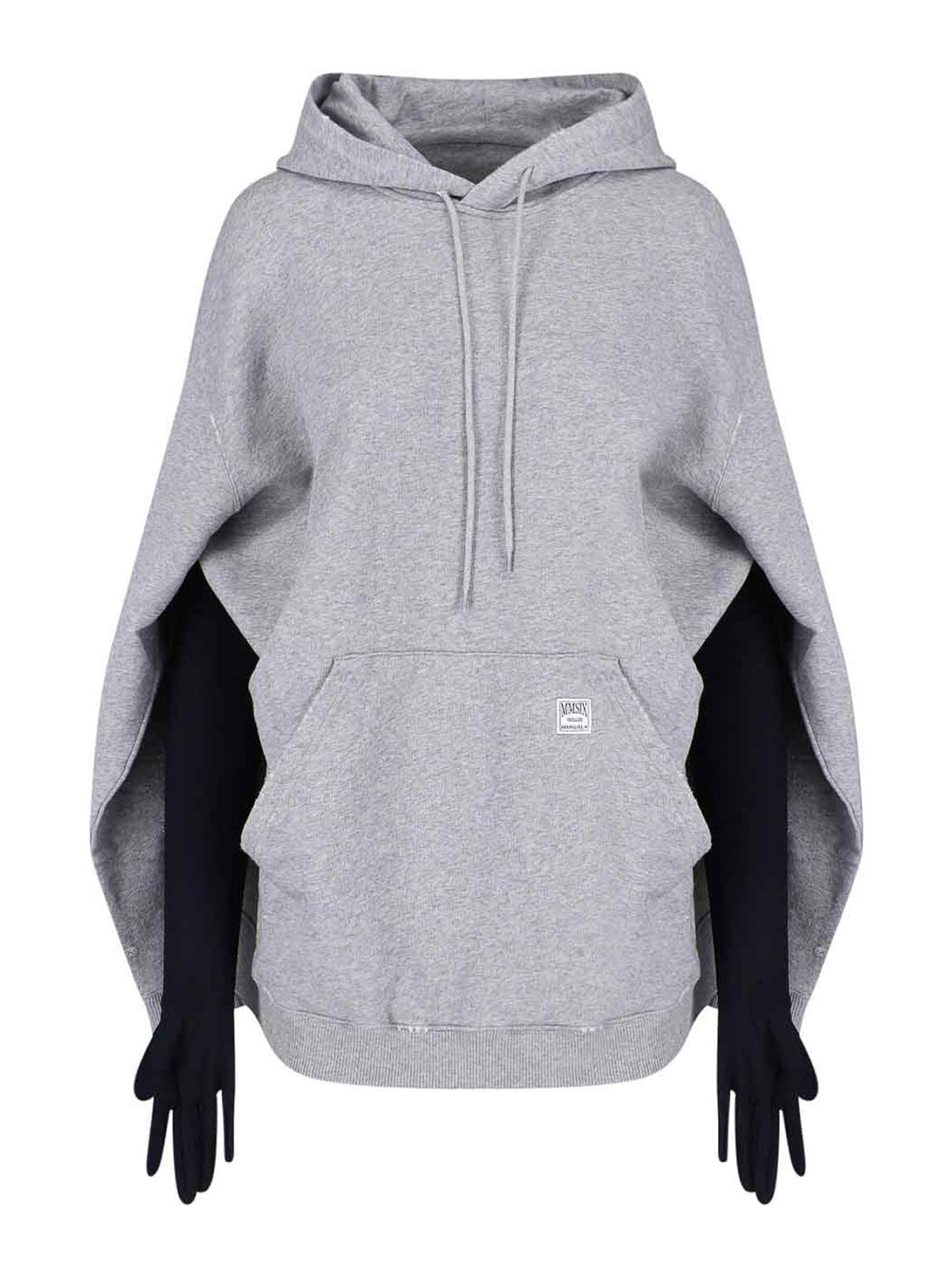 Mini-robe avec gants Maison Margiela mm6, en coton gris, capuche avec cordon de serrage, épaules tombantes, détail de gant ajustable à la taille, étiquette logo sur le devant, une grande poche avant, finitions côtelées, effet usé, ourlet droit.