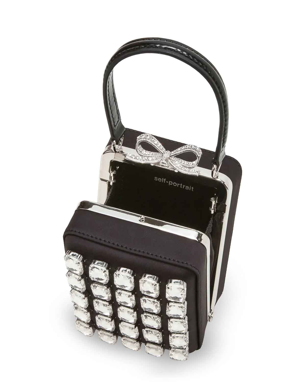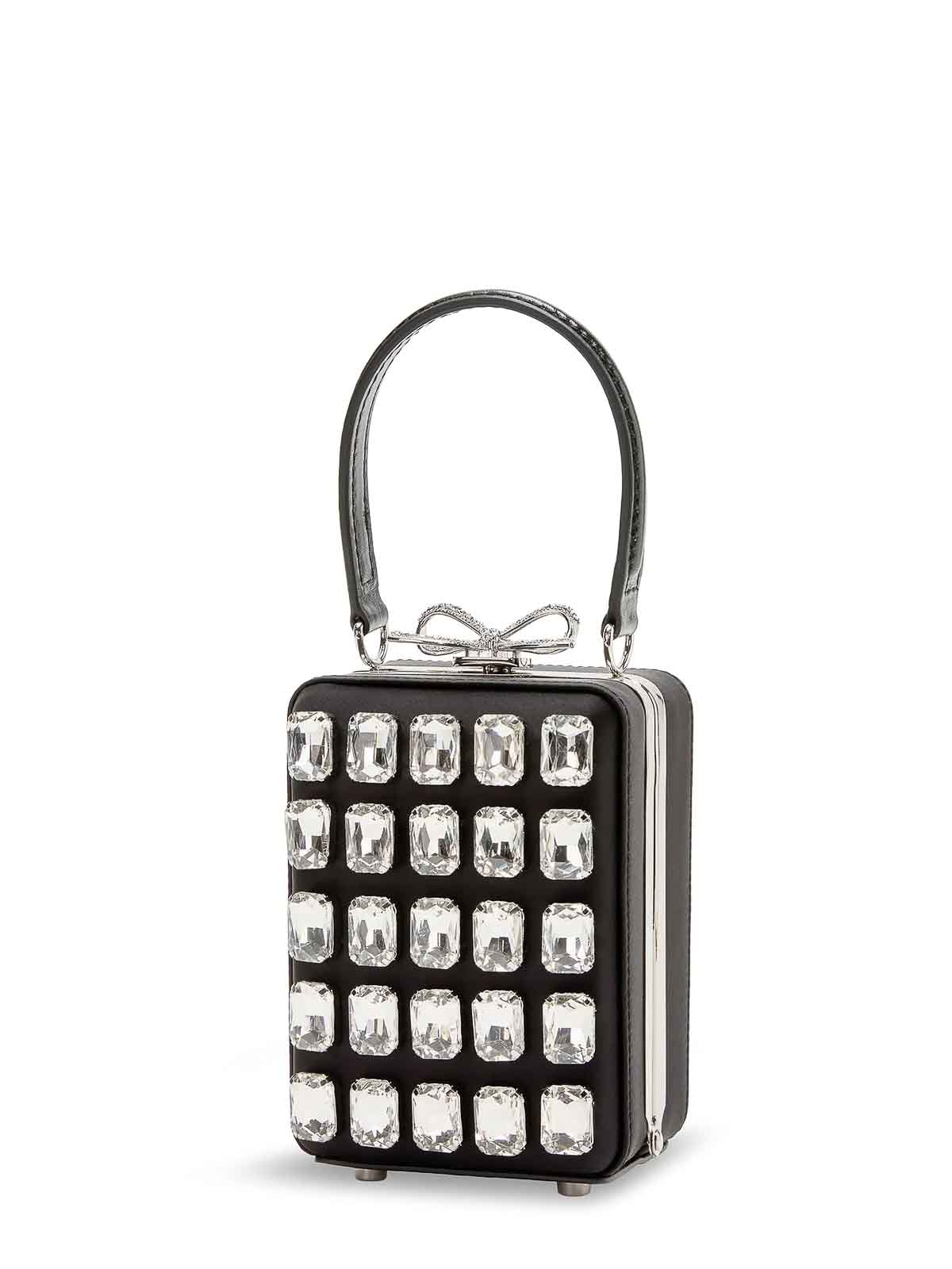 Poignée en cuir, fermeture à crochet, nœud en cristal, bandoulière en métal amovible, une poche intérieure, satin/cristaux, L : 11 cm, H : 13 cm, P : 6 cm.