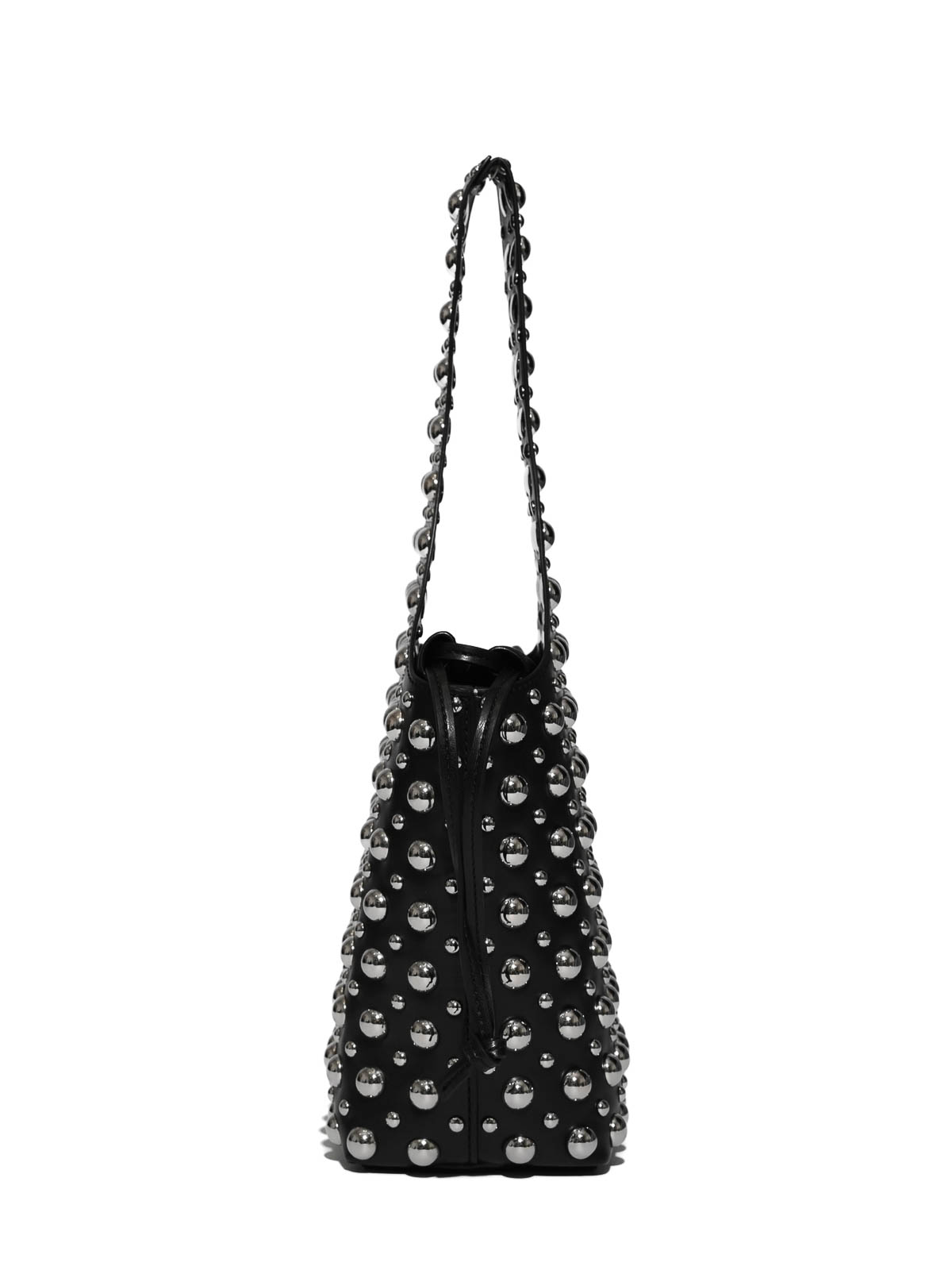 Sac seau pour femme en cuir végétalien, Liviana Conti, modèle Debby, matière : cuir végétalien, motif : couleur unie, fermeture : cordon de serrage avec lacets latéraux, poignées/bandoulière : poignée intégrée, porte-épaule, poches : poche intérieure, détails : applications de clous métalliques, coutures apparentes, doublure : s, capacité : moyenne, taille/usure : épaule