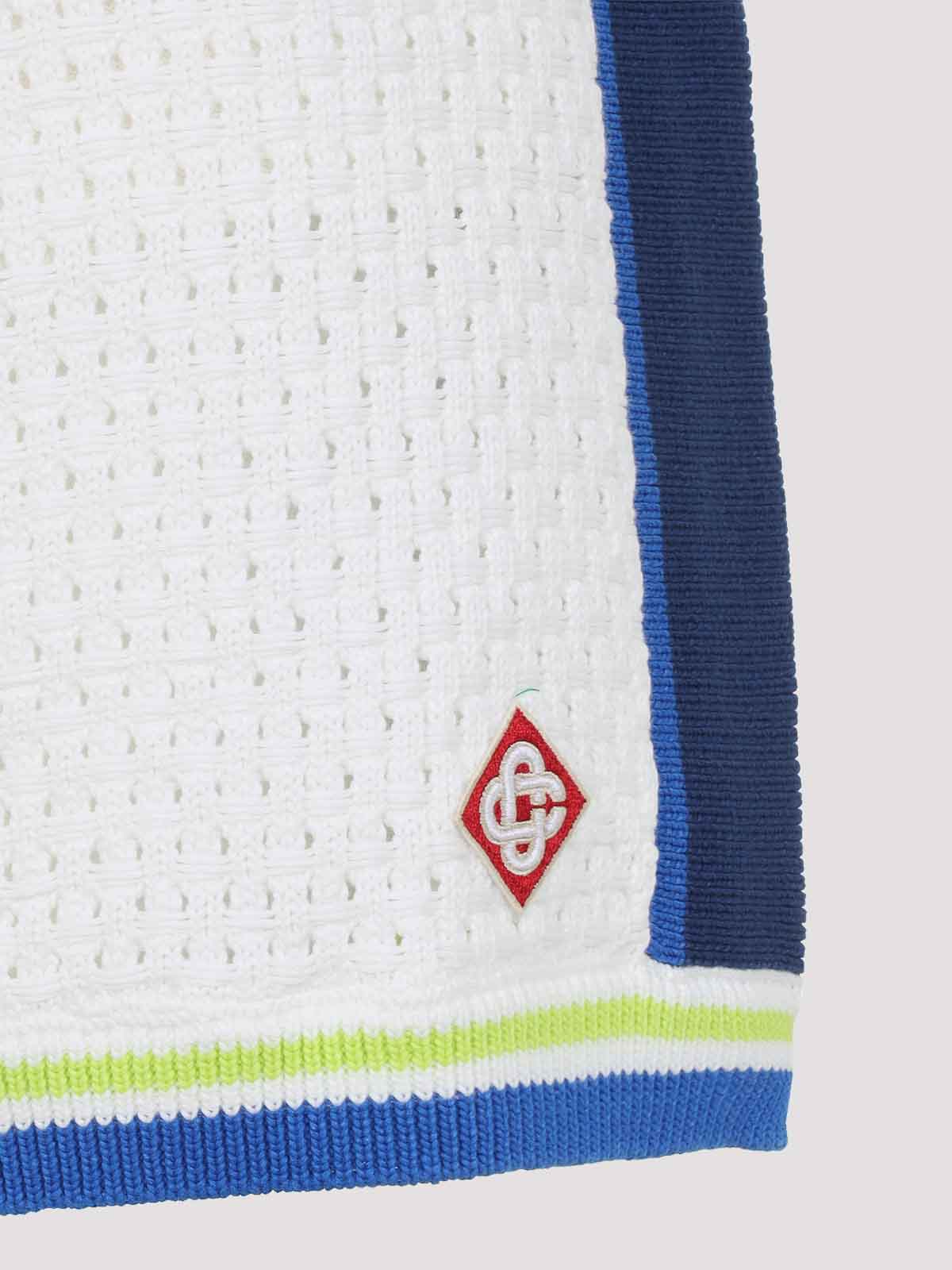 Short en crochet en coton blanc Casablanca. Fabriqué en coton et polyester. Taille élastique, bande latérale côtelée bleue contrastante, logo emblématique sur le côté, détails côtelés bleus et verts sur l'ourlet, ourlet droit.