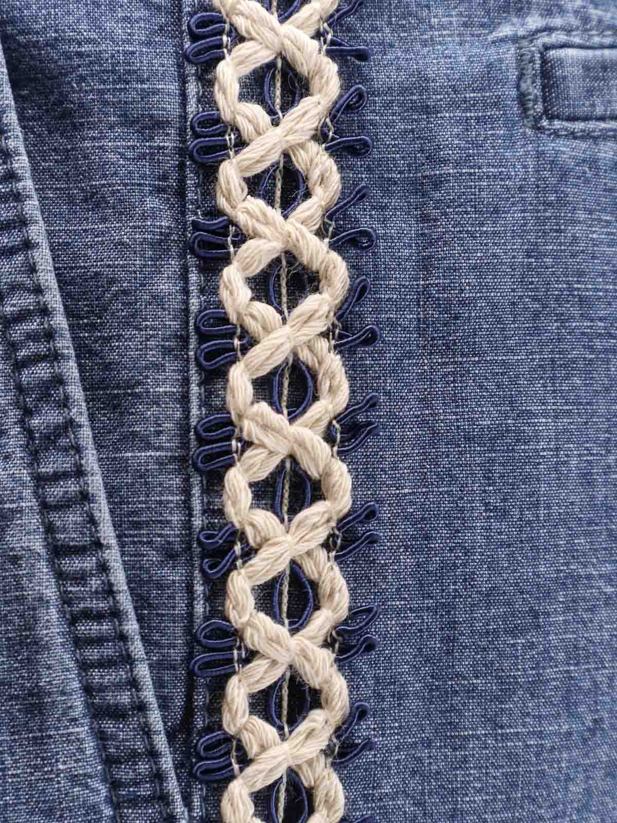 Fermeture zippée, bouton et crochet en métal, poches obliques sur le devant, deux poches arrière passepoilées, profils latéraux brodés, fabriqué en Italie, 100 % coton.