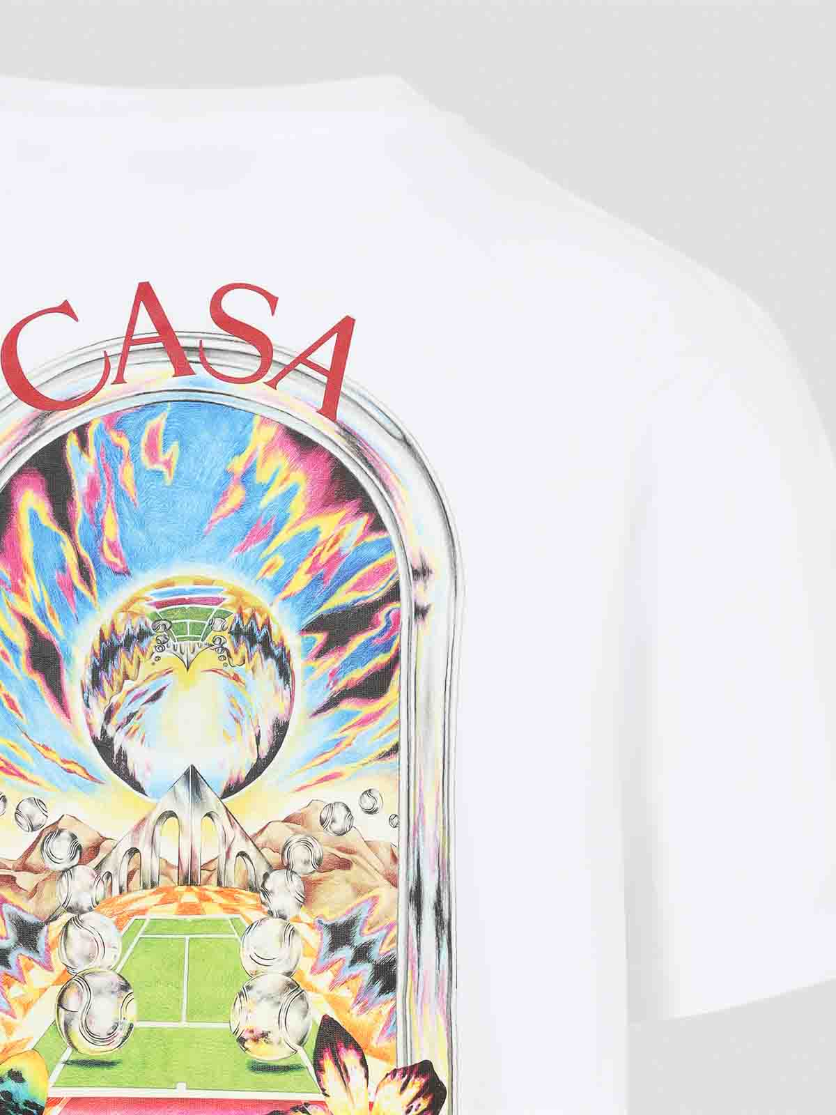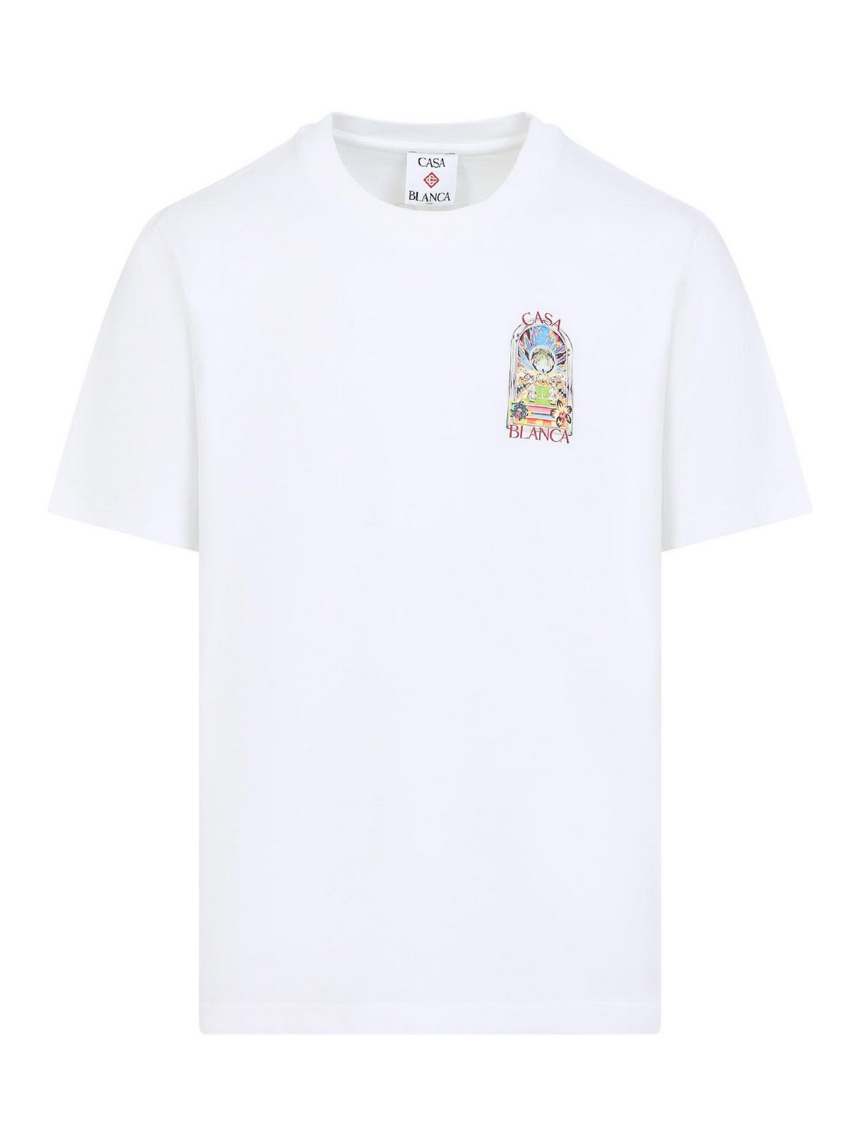 T-shirt en coton blanc Casablanca Orchid Court, confectionné en jersey de coton blanc, doté d'une encolure ronde côtelée, d'un logo et d'un graphisme sur la poitrine et dans le dos, de manches courtes et d'un ourlet droit.