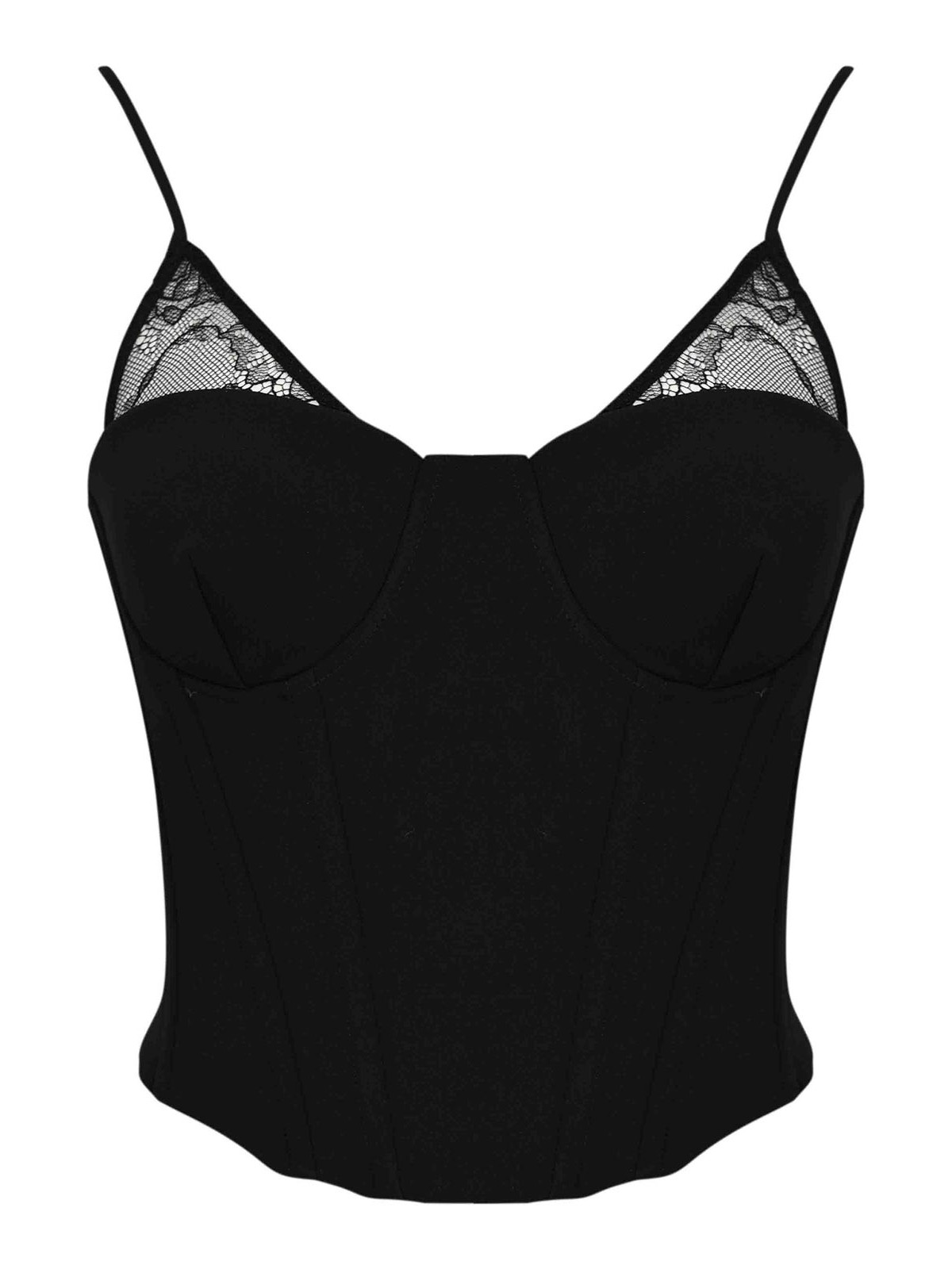 Top pour femme en crêpe stretch avec détails en dentelle, Patrizia Pepe, tissu : crêpe extensible, motif : couleur unie, manches : sans manches avec fines bretelles réglables, col : encolure en cœur, fermeture : dos avec crochets, poches : absentes, détails : structure corset avec coutures profilées, inserts en dentelle sur les bonnets, application du logo en forme de braguette métallique sur les bretelles, doublure : s, coupe : moulante