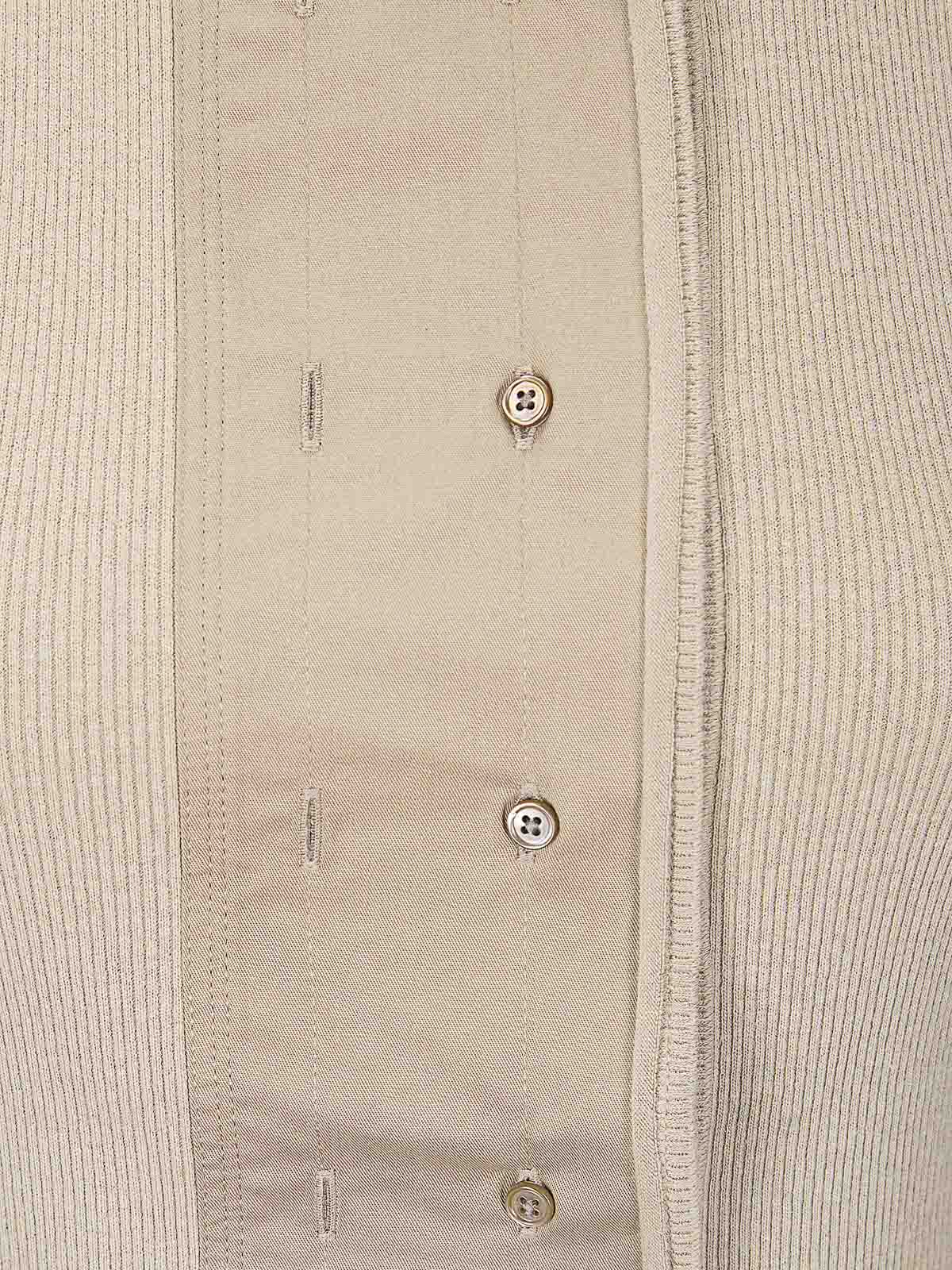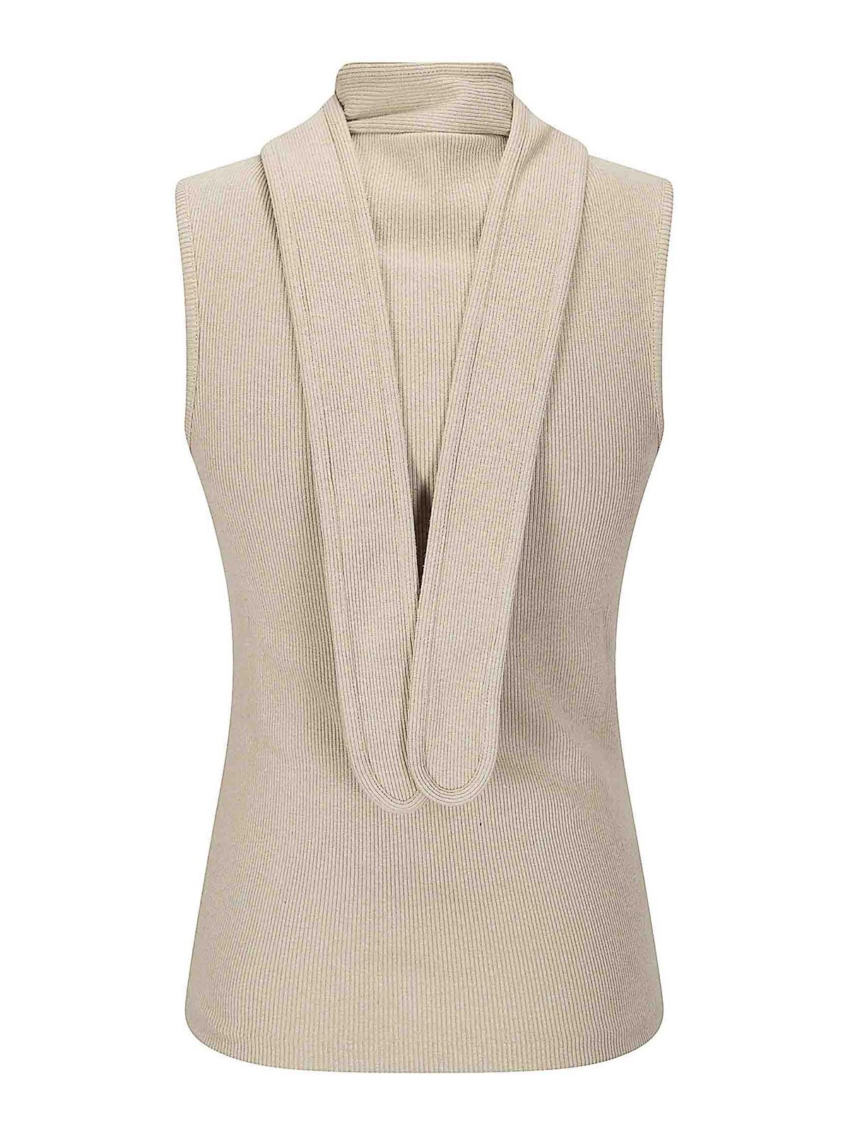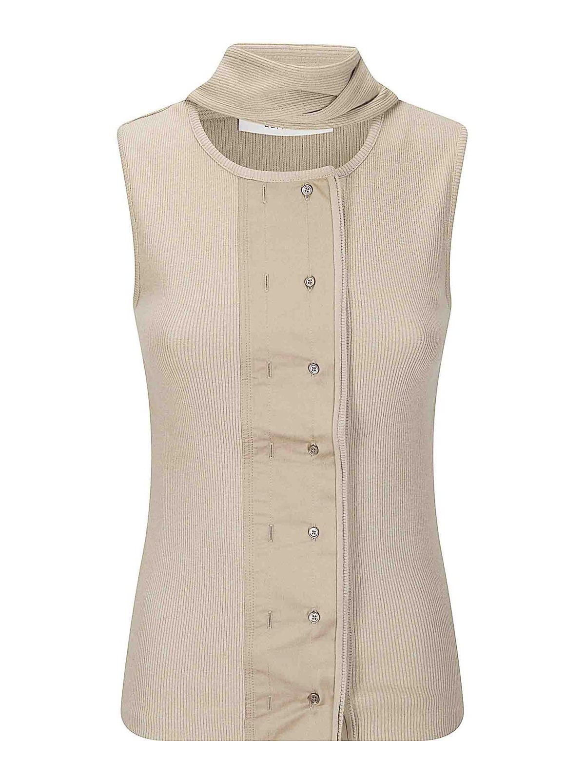 Top côtelé à col rond avec fermeture à double bouton, caractérisé par deux lacets à nouer au niveau du cou.