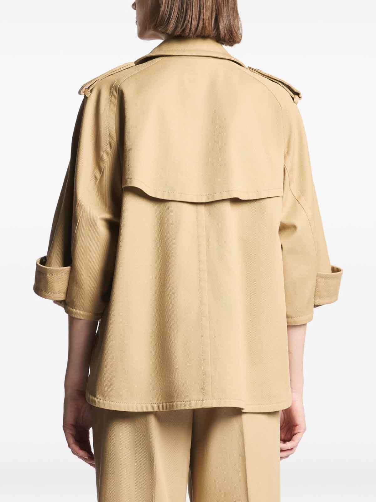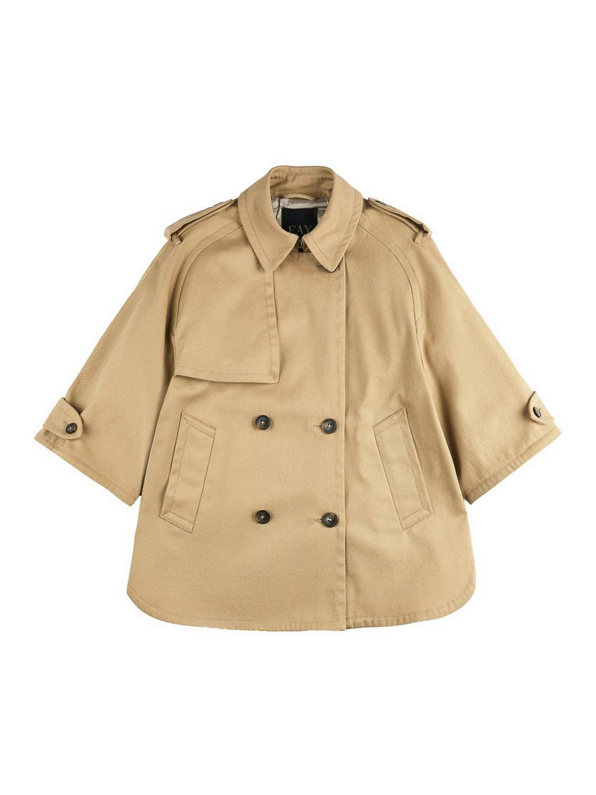 Trench-caban marron clair de Fay en coton perlé à finition hydrofuge, doté d'un double boutonnage sur le devant, de manches courtes, d'un rabat avant, d'épaulettes aux épaules et aux manches et de poches latérales. Orné du logo Fay brodé sur le dessous du col, ce modèle allie design emblématique et fonctionnalité pratique. parfait pour le style printanier et estival, le trench offre un style sophistiqué et un confort léger pour les tenues décontractées chic ou urbaines.