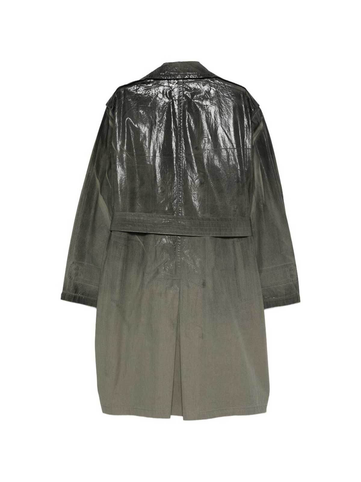 Trench en coton enduit dégradé de la marque Maison Margiela, doté d'une fermeture boutonnée sur le devant et d'une ceinture. Fabriqué en coton durable légèrement brillant, ce trench allie élégance et fonctionnalité, parfait pour les tenues formelles ou les looks contemporains sophistiqués. La finition dégradée et les détails ajustés font de ce trench une pièce incontournable de toute garde-robe moderne