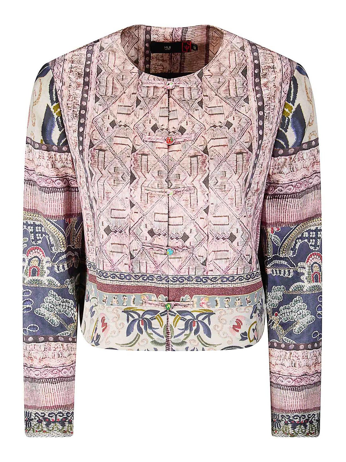 Chemise courte en soie légère avec fermeture frontale typique, petits boutons décorés.