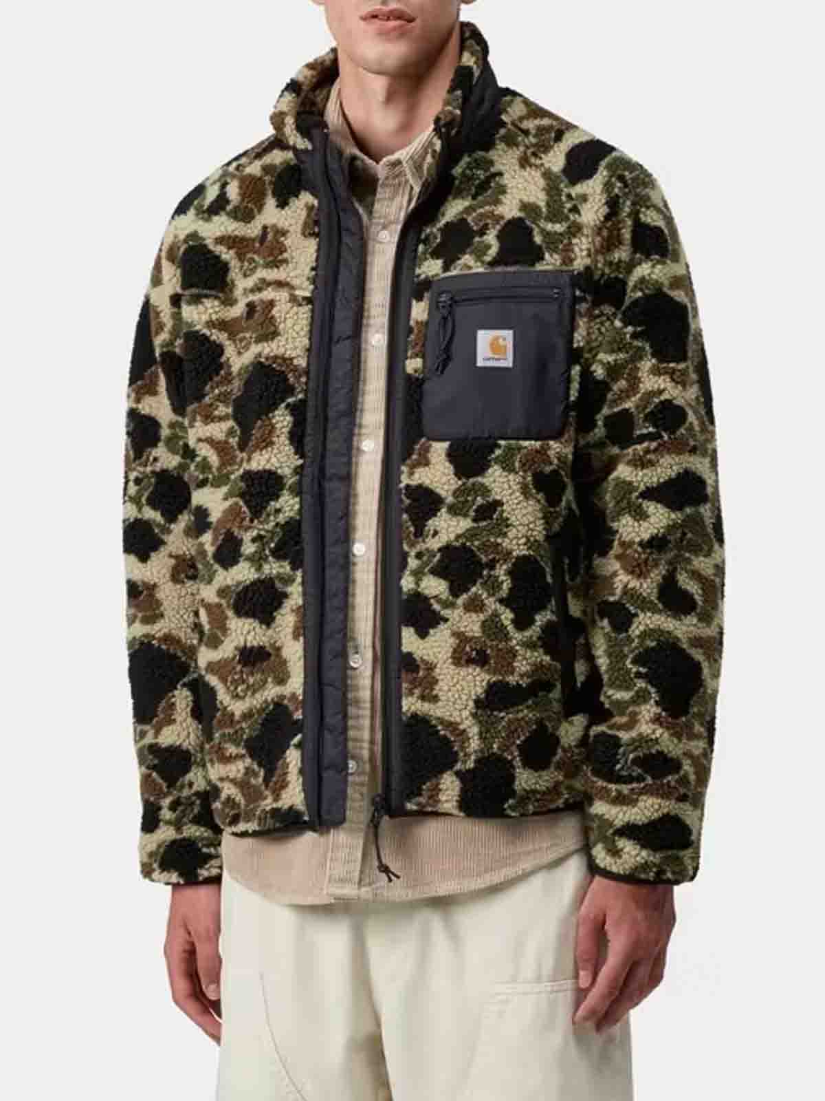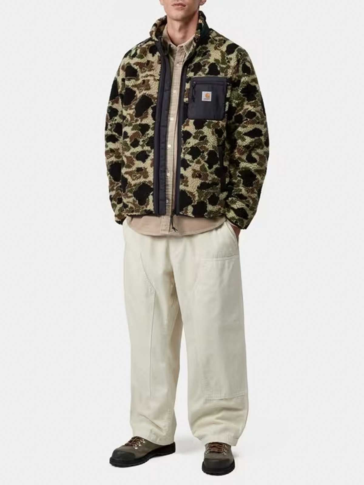 Design de camouflage à poils noirs de créateur doublé de maille sur le corps, taffetas sur les manches et la poche poitrine, col en entonnoir zippé, écusson logo sur la poche poitrine, une poche poitrine à rabat, deux poches extérieures