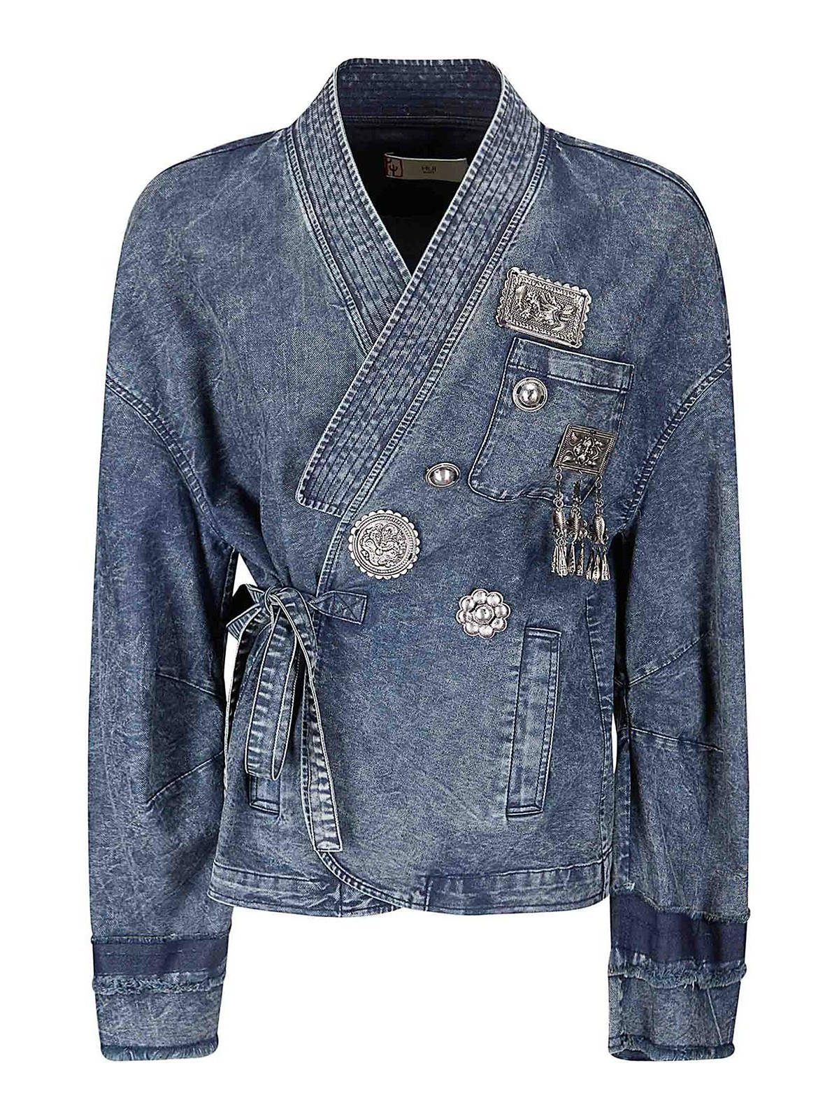 Veste en jean légère avec détails contrastants, design de style chinois, fermeture à cordon.