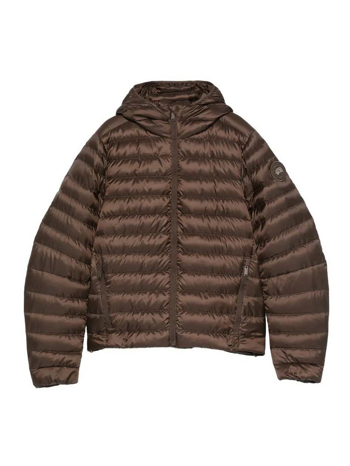 Designer terra brown quilted hooded zip logo patch side zip pockets ---
