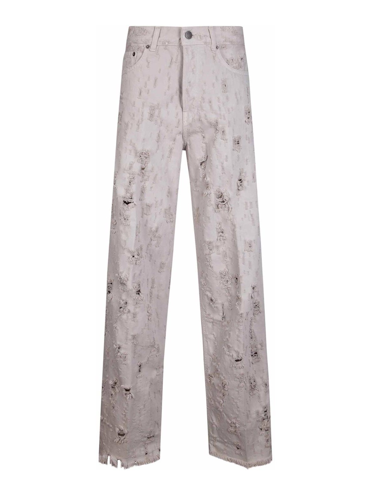 Five pocket jeans, zip and button closure, wide leg, destroyed effect.