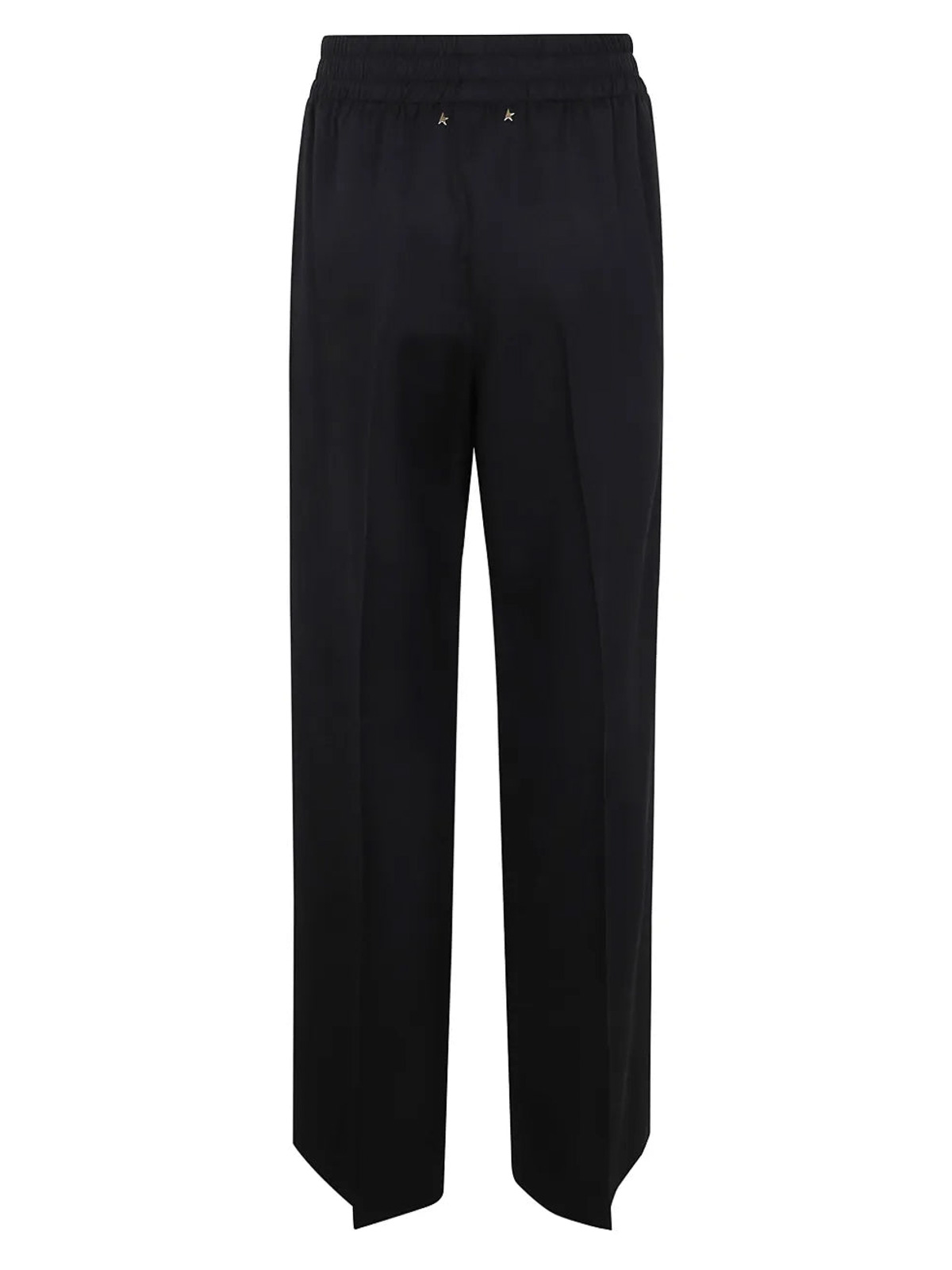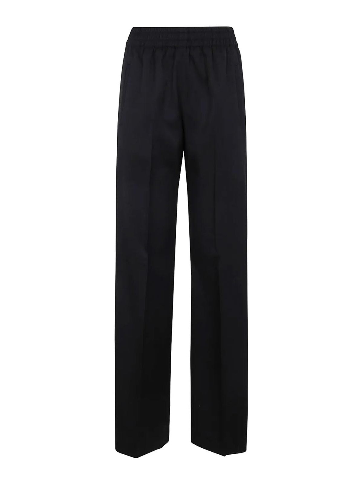 straight trousers with elasticated waist, ironed crease, two side welt pockets.