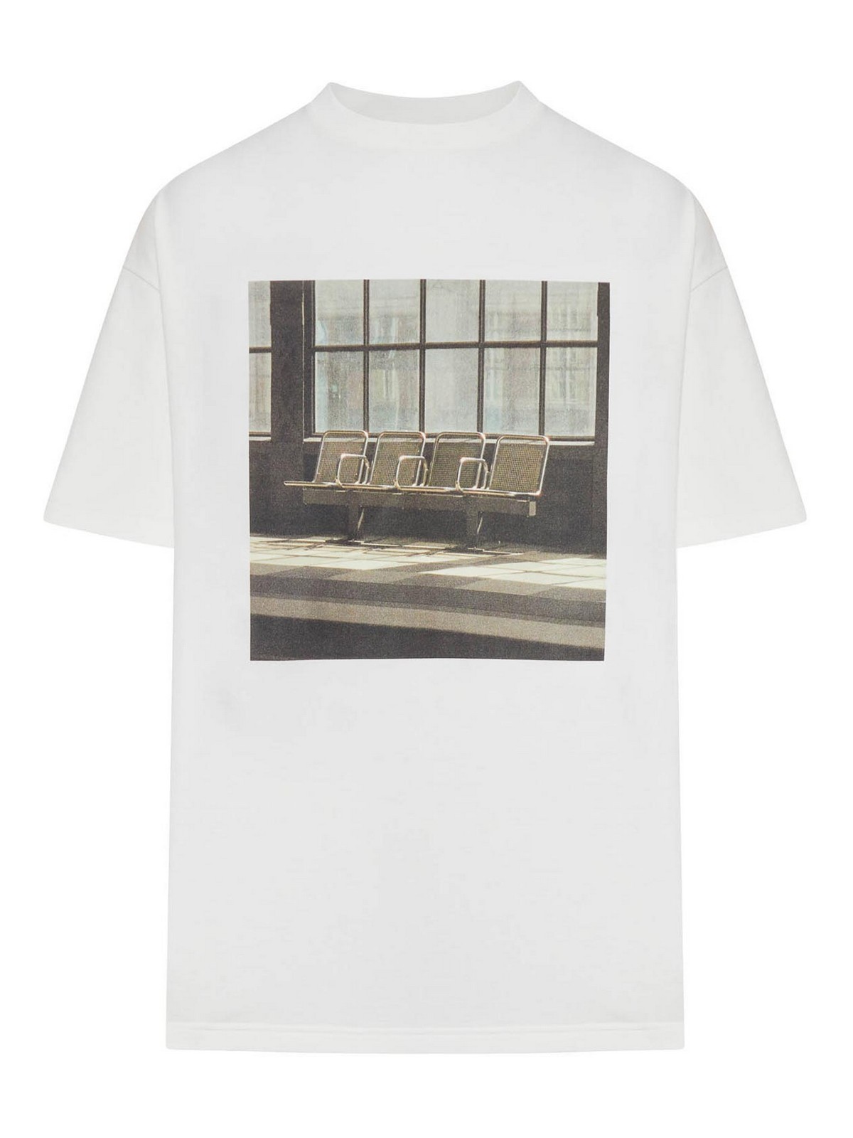 crew neck, short sleeves, photographic print on the front, text print on the back, slightly loose fit, straight hem, 100% cotton, color: white