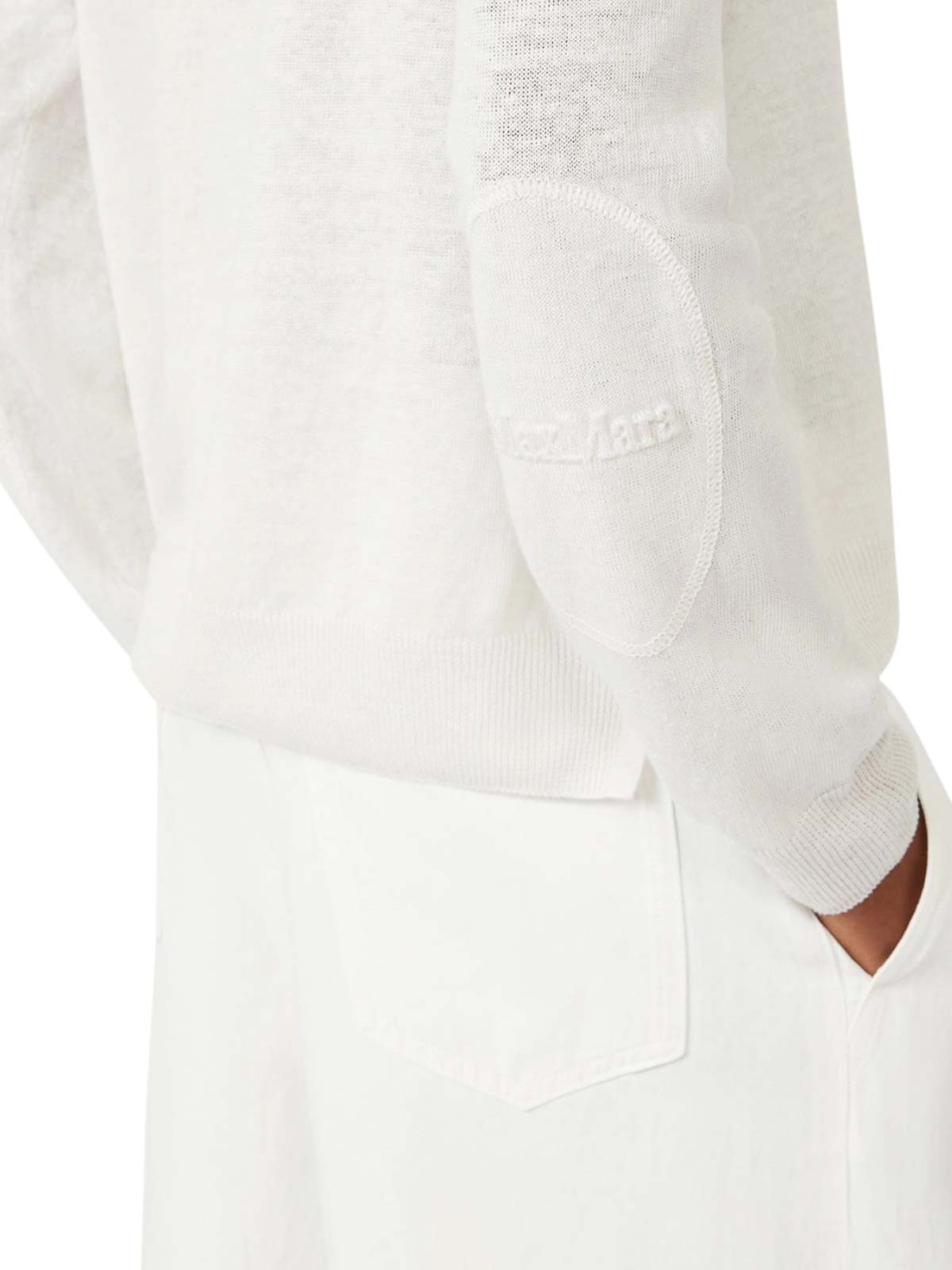 crew neck, long set-in sleeves, ribbed cuffs and hem, solid-color knit patches with embossed logo on the elbows, lightweight pure linen yarn, straight fit, 100% linen, the model wears size m and is 178 cm tall, color: white