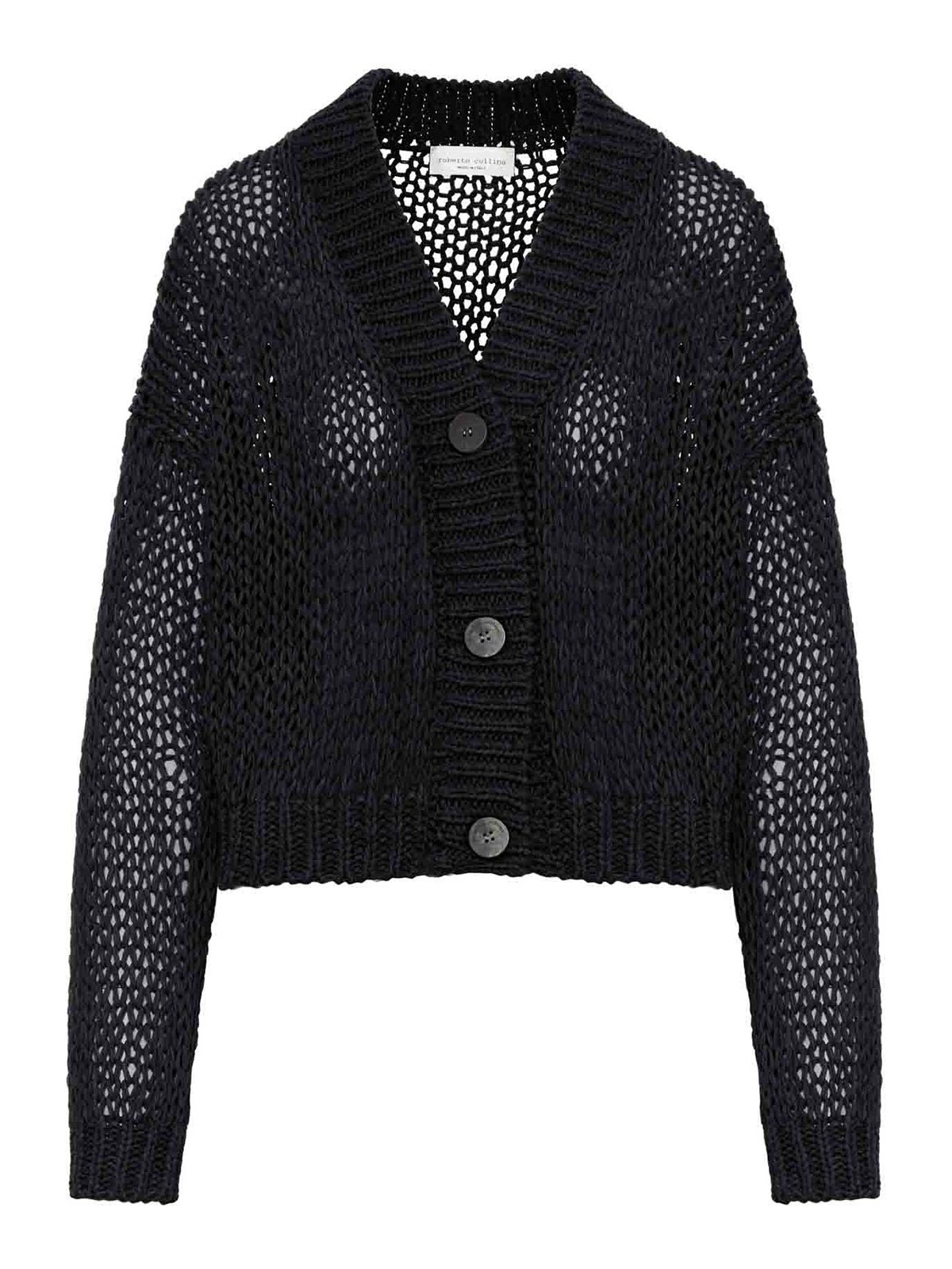 cropped cardigan in a loose-knit, openwork design, semi-sheer mesh effect, deep v-neck with a wide ribbed band, front closure with exposed dark-tone buttons, long sleeves with slightly dropped shoulders, ribbed cuffs and hem for a defined fit, regular fit, color: black