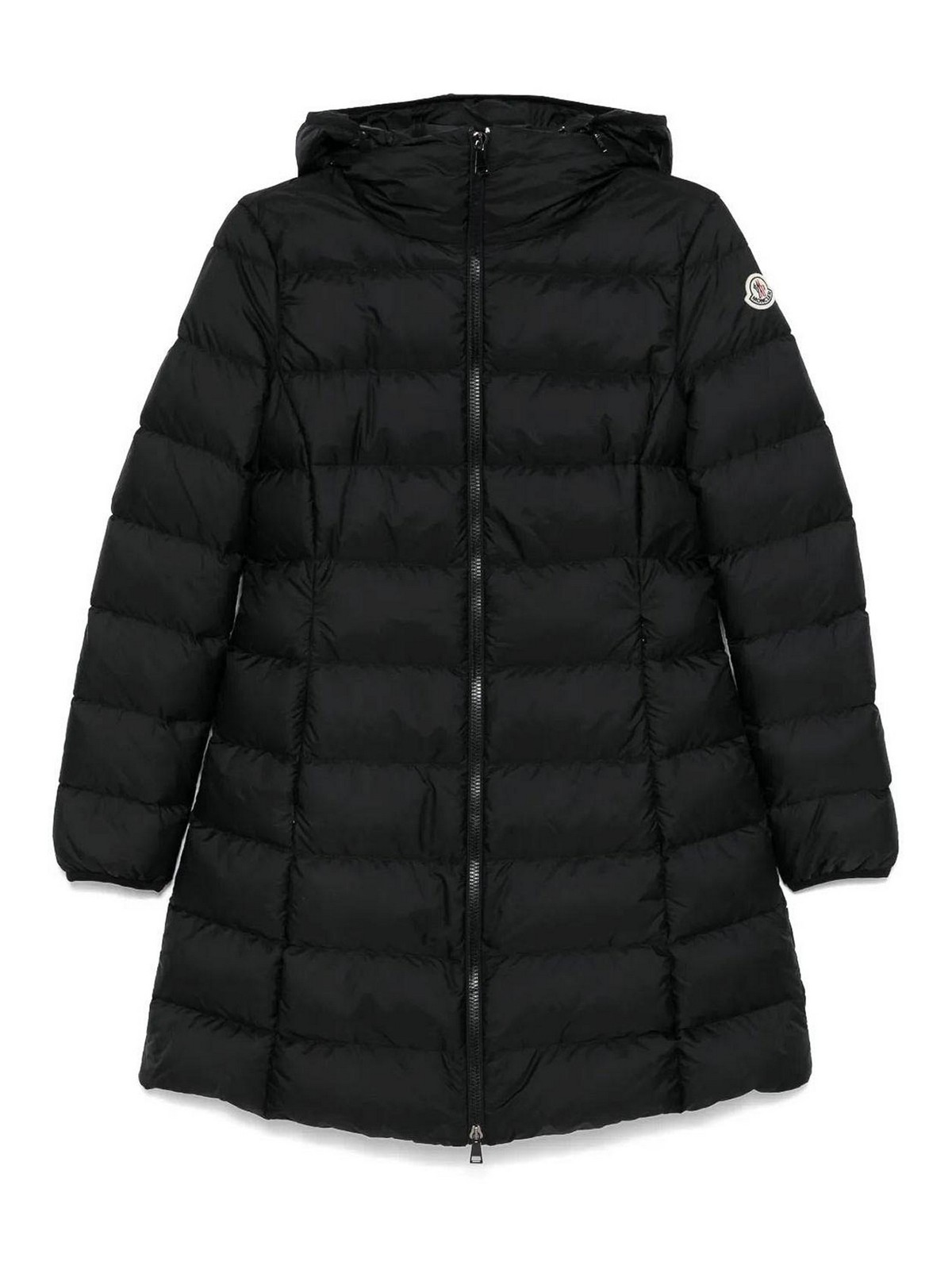 Black feather down padded design quilted water-repellent front two-way zip fastening funnel neck slouchy hood long sleeves logo patch at the sleeve elasticated cuffs two side zip-fastening pockets full lining slight flare straight hem
