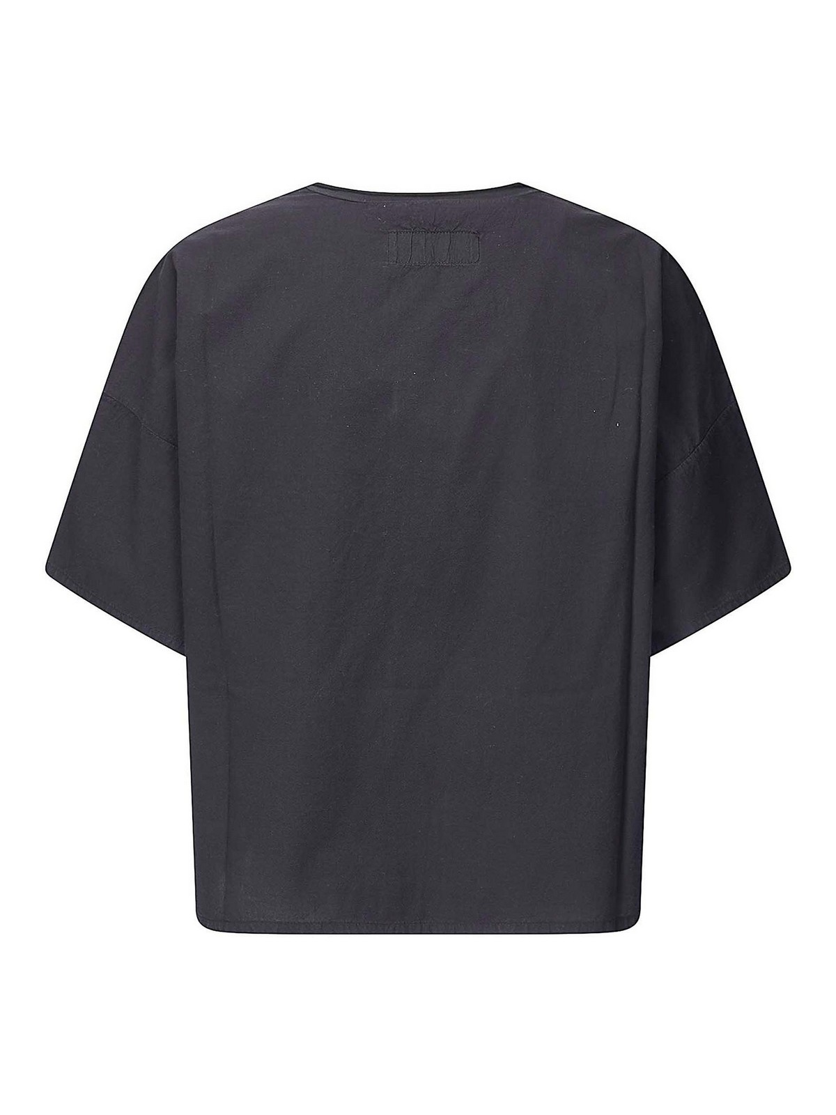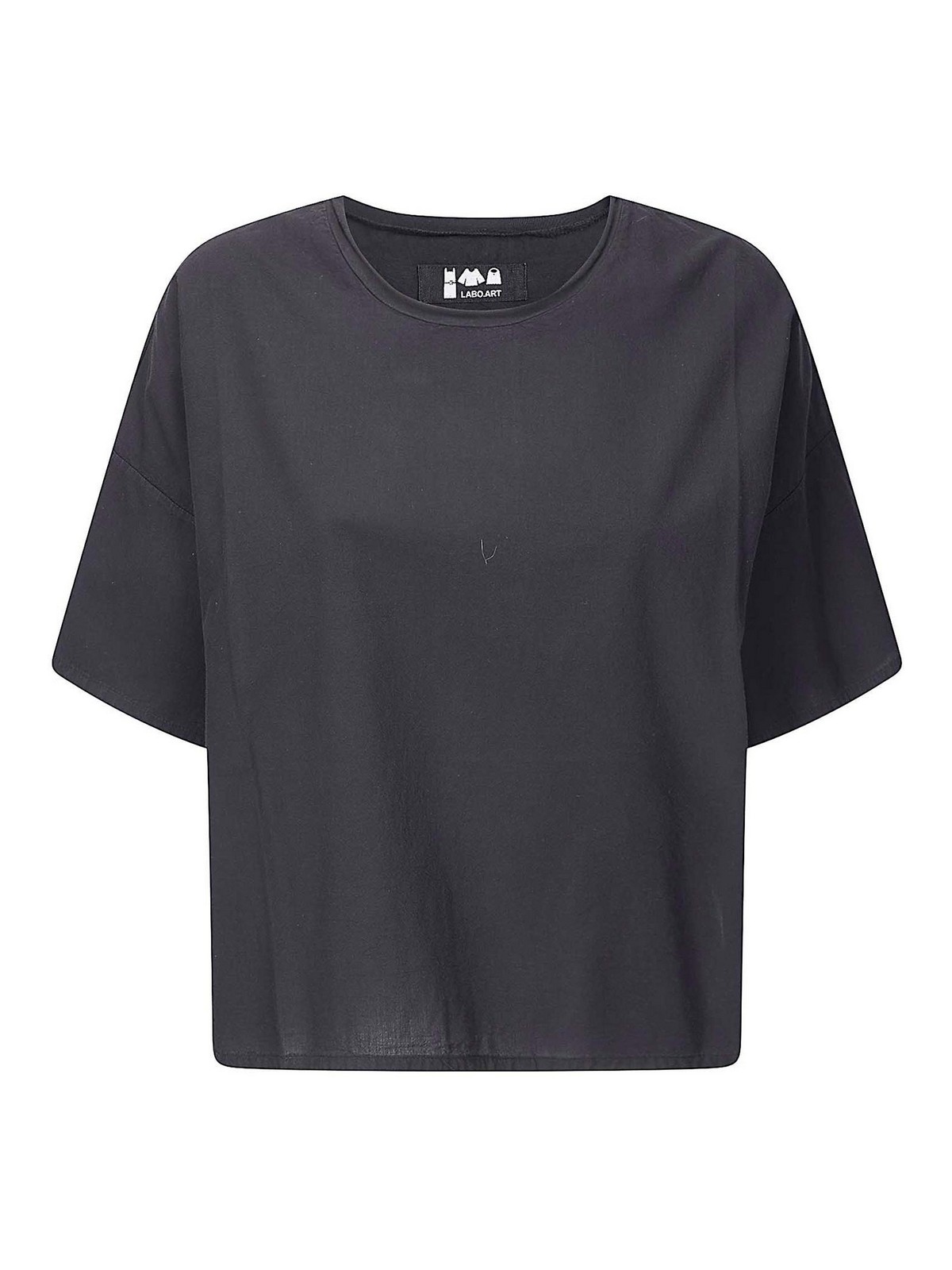 Lightweight crepe-effect cotton sweater with contrasting collar and short sleeves, comfortable and short fit.