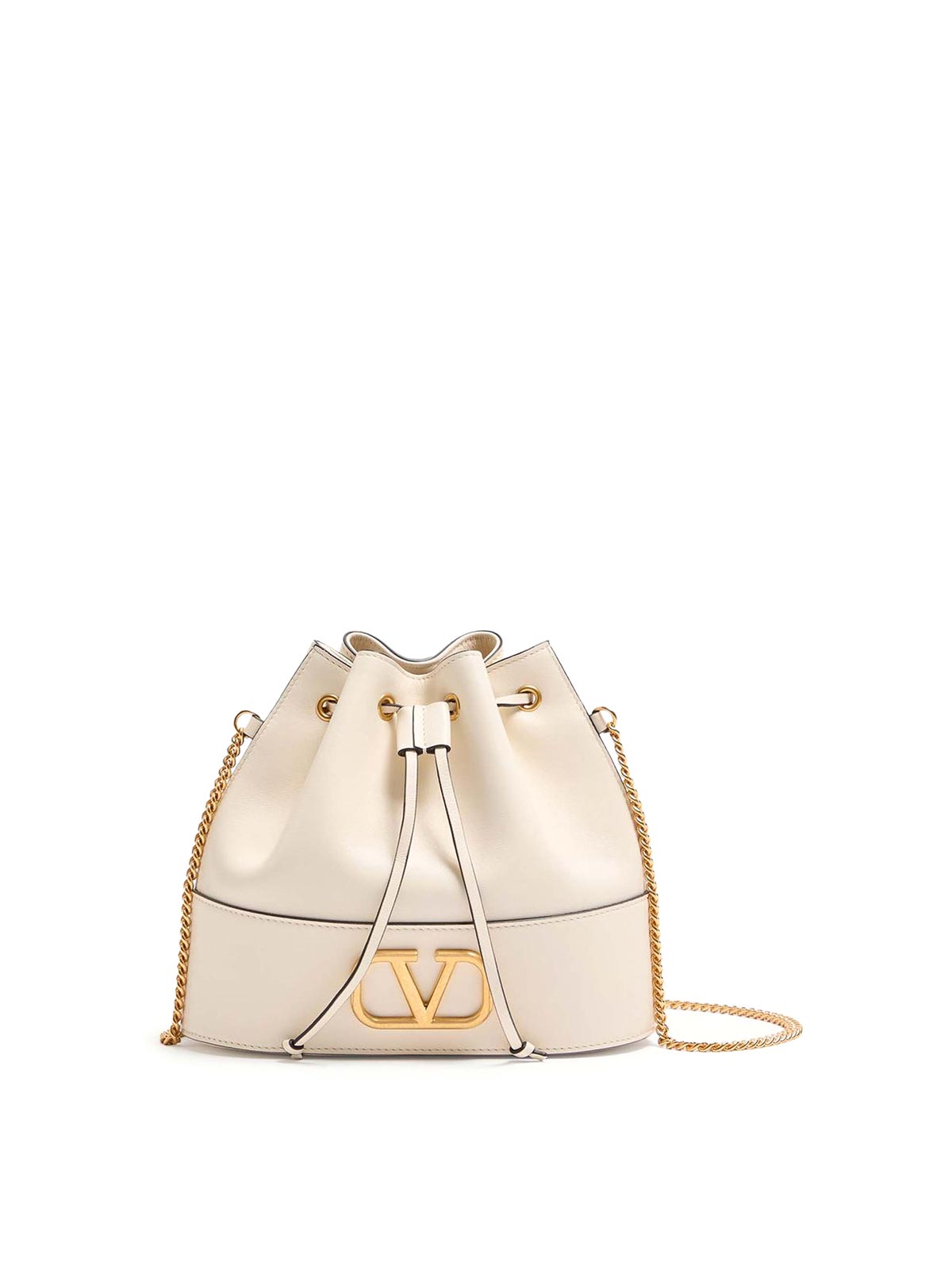 Valentino garavani vlogo signature mini bucket bag with chain antiqued, finish logo and hardware drawstring and chain shoulder strap chain height