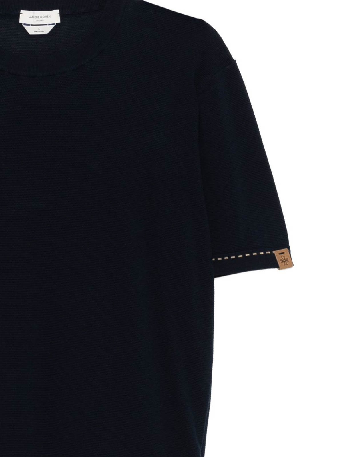 T-shirt by jacob cohn, crafted from soft navy blue fabric with round neck and short sleeves. featuring embroidered details and logo patch, with a straight hem for a clean and elegant design. perfect for casual yet refined outfits, combining everyday comfort with premium quality from the italian brand.