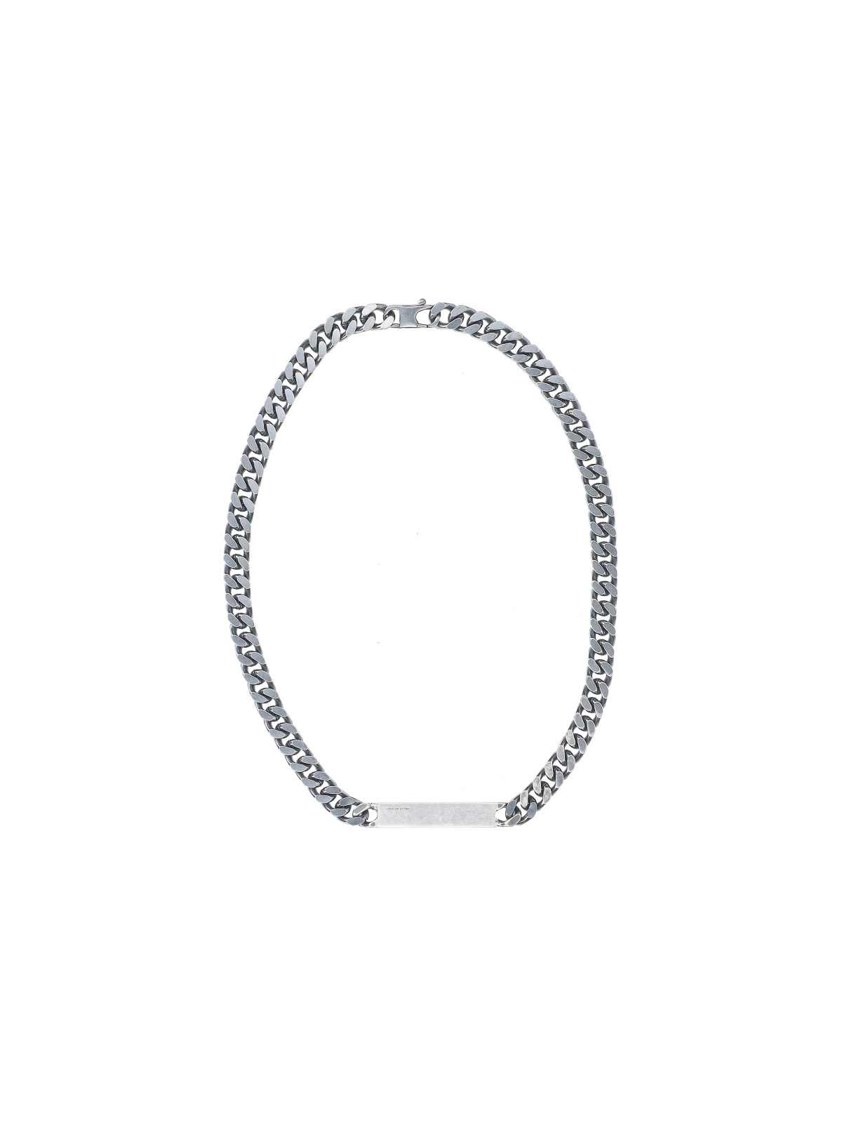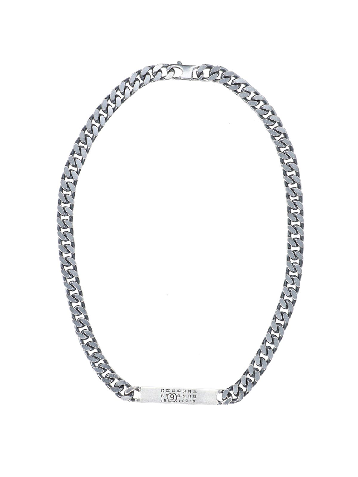 Maison Margiela mm6 numeric necklace in silver-plated brass, numeric logo tag on the front, closure on the back.