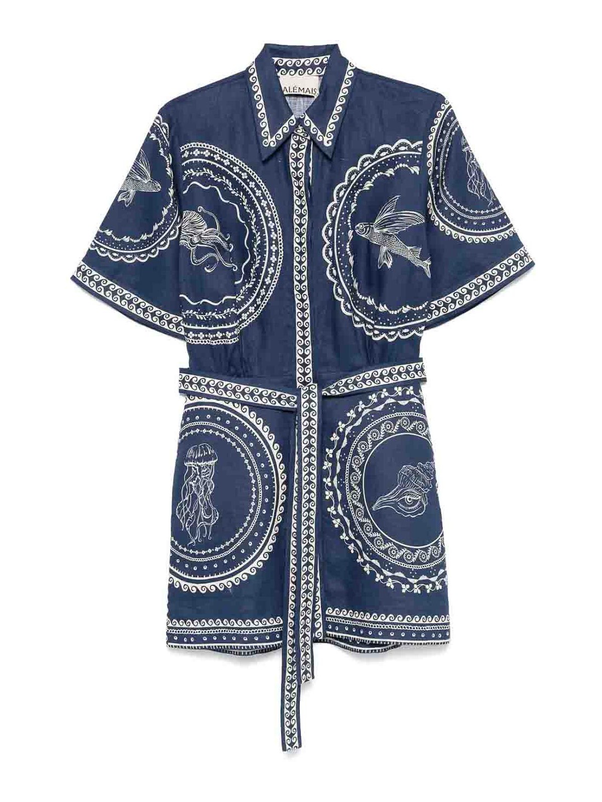Designer navy blue concealed button detachable waist belt two side slit pockets all-over graphic print ---
