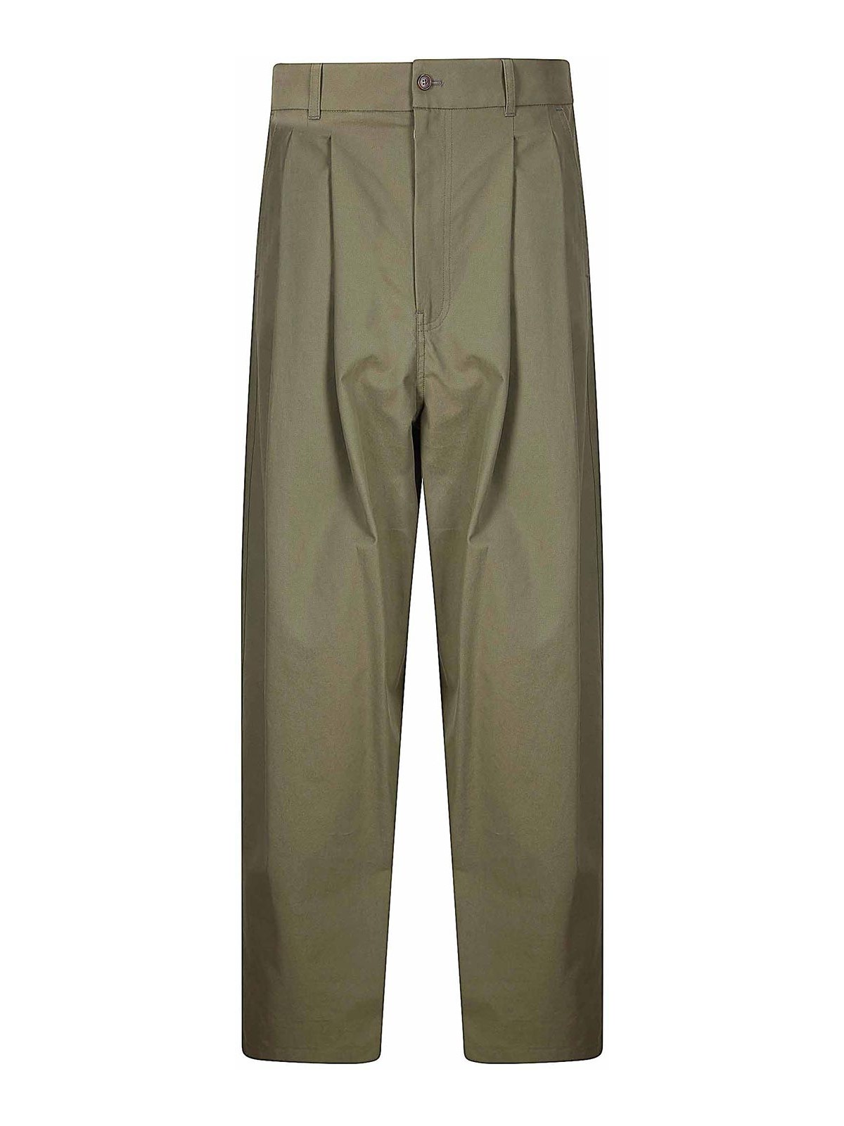 High-waisted oversized trousers, button and zip closure, side pockets, pleats, straight leg.