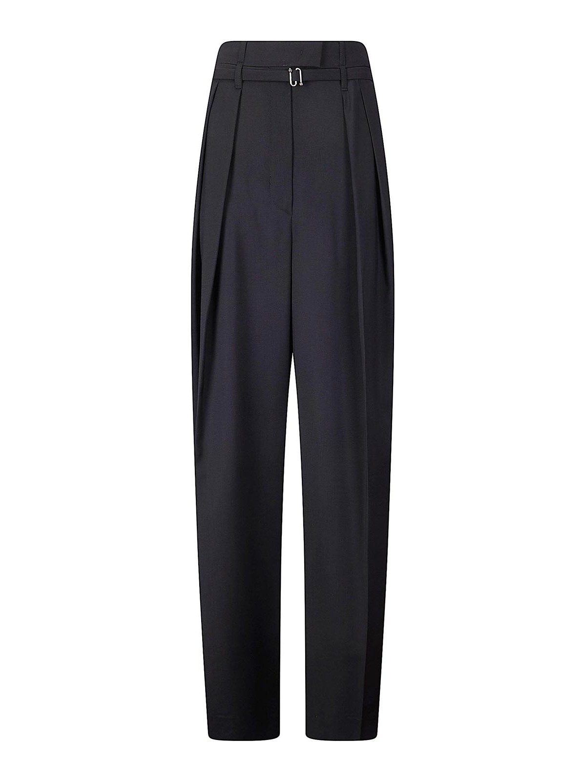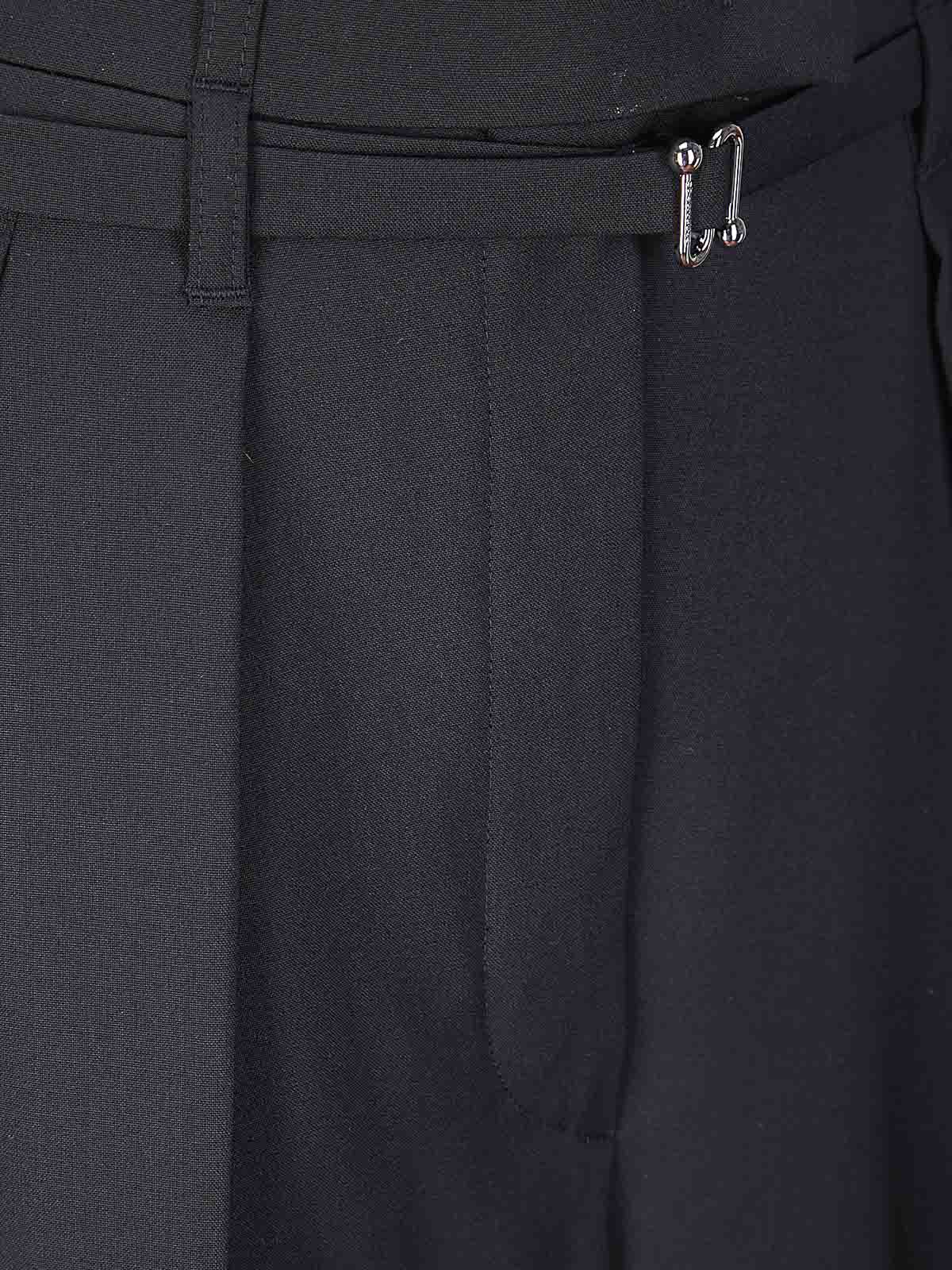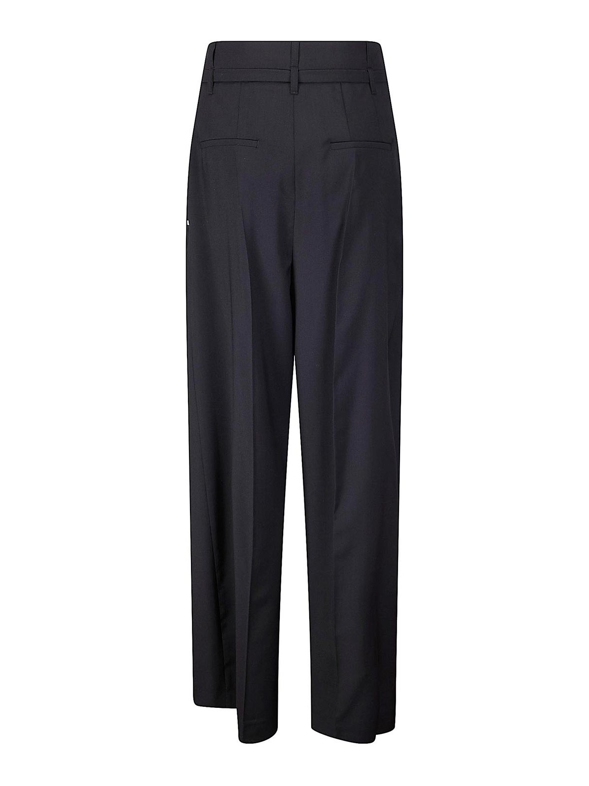 Trousers characterized by wide leg, waist with darts, hook and zip closure, two side pockets, two rear welt pockets and regular fit.