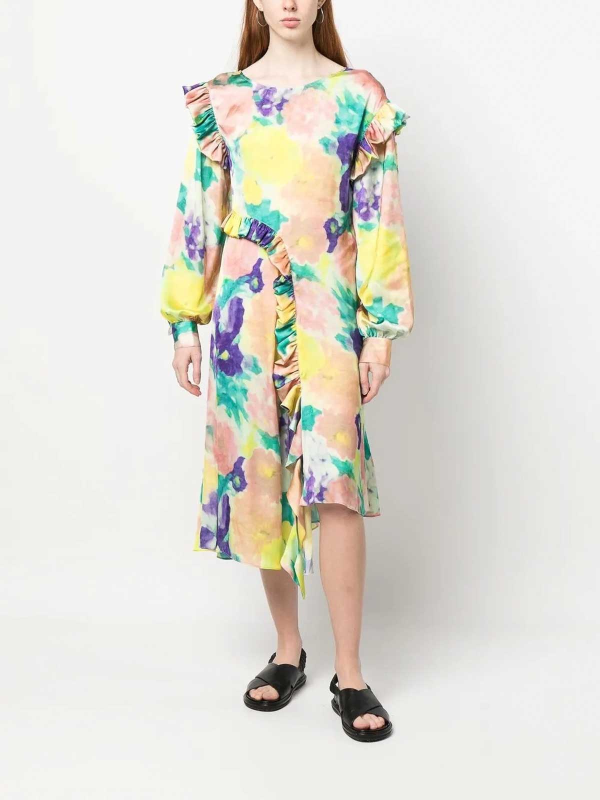 Designer clay comb multicolour all, over floral print ruffled detailing long sleeves mid, length